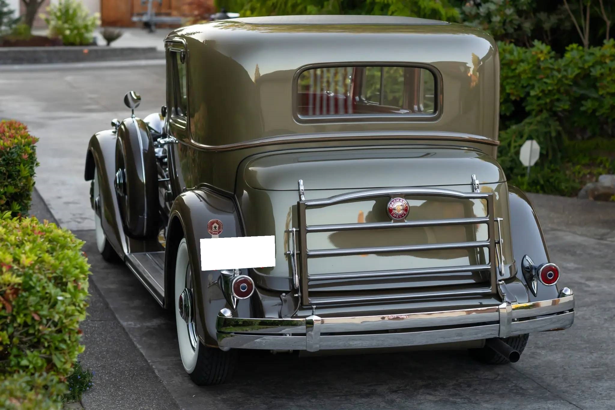 The body is said to have undergone a repaint during the 1997 refurbishment by Mosier Restoration of Inglewood, California, in Bruin Beige No. 1 and Bruin Beige No. 4 with Sunset Tan pinstriping. Features include counterweighted front and rear bumpers, driving lights, thermostatically controlled grille shutters, a cormorant radiator mascot, and a fold-down rear luggage rack. A CCCA Premier Senior First Prize badge is affixed ahead of the right-front door.