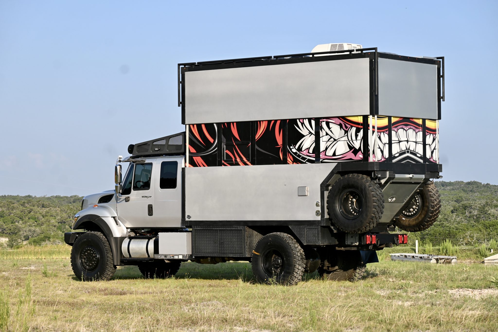 Black 17″ alloy wheels are mounted with 395/85 Michelin X, and two spares are secured to the back of the camper. The truck rides on leaf springs and solid axles.