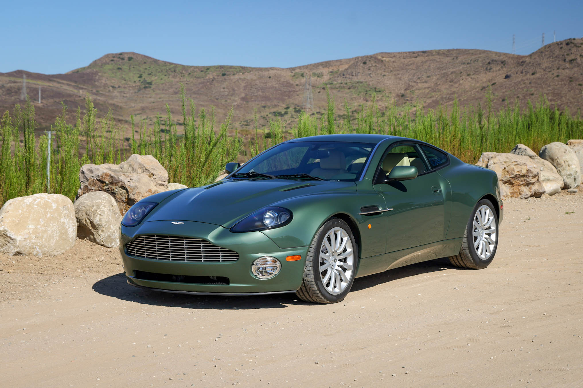 The 19″ 12-spoke alloy wheels are mounted with Pirelli P Zero tires measuring 255/40 up front and 285/40 out back. Curb marks are noted on the right-front wheel. Stopping is handled by gray-finished Aston Martin-branded calipers over cross-drilled and ventilated rotors at all four corners. The rear toe links and sway bar end links were replaced in May 2021.