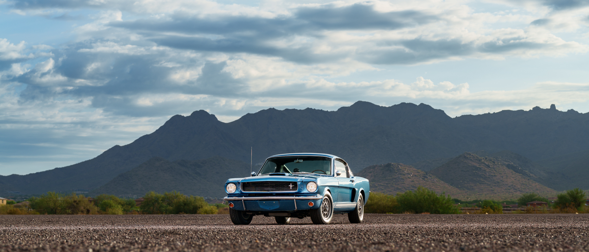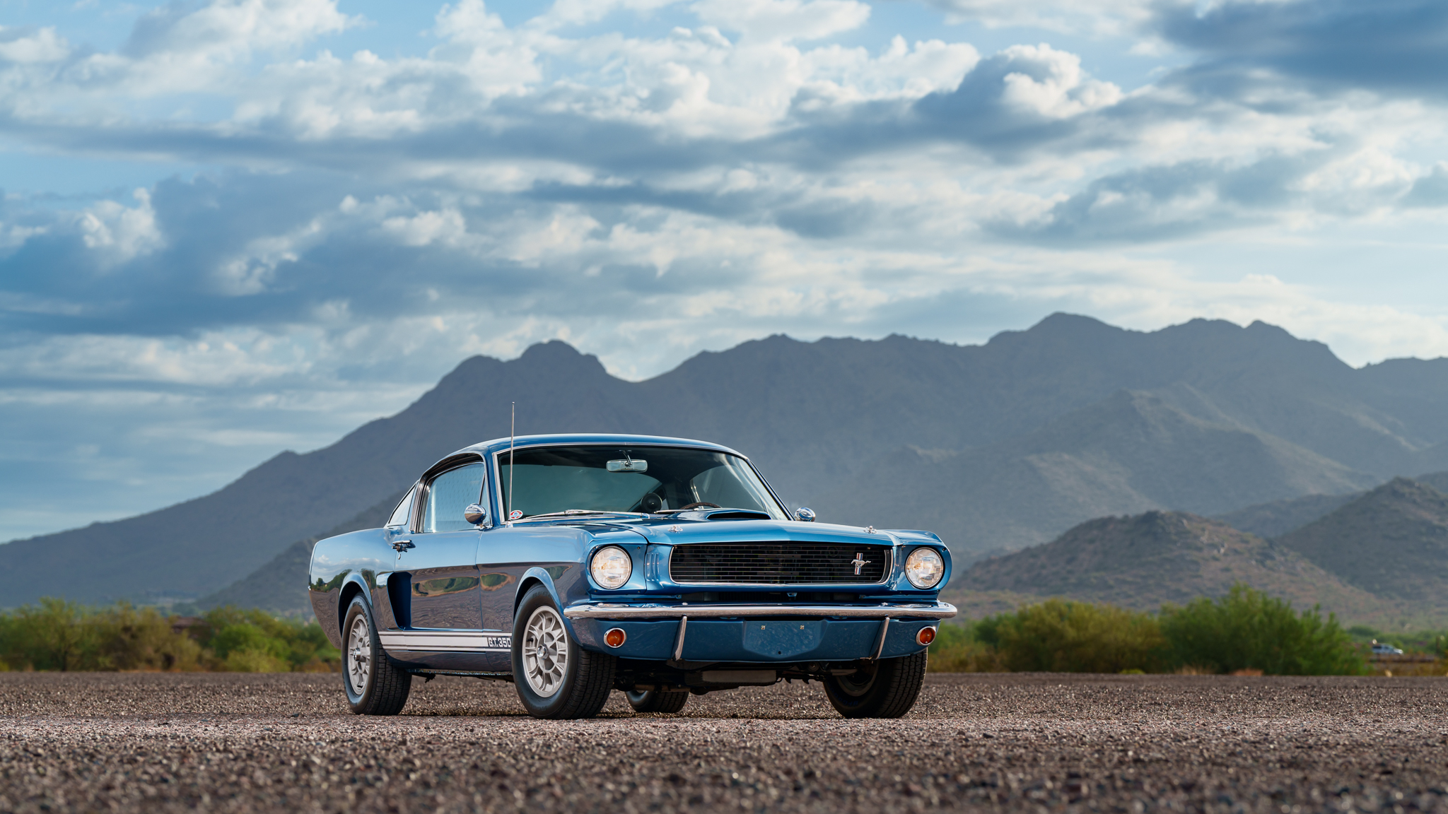 The car was ordered with optional 14″ 10-spoke alloys, and the BFGoodrich tires measure 205/70. GT350s were factory-equipped with Kelsey-Hayes front disc brakes as well as larger rear drums than standard Mustangs, and the suspension geometry was reworked with lowered inner pivots of the front control arms, heavy-duty springs, Koni shocks, override traction bars, and rear torque-control arms. The rear drums were reportedly replaced with unused factory components around 2021, at which time an upgraded brake-bias valve was fitted.