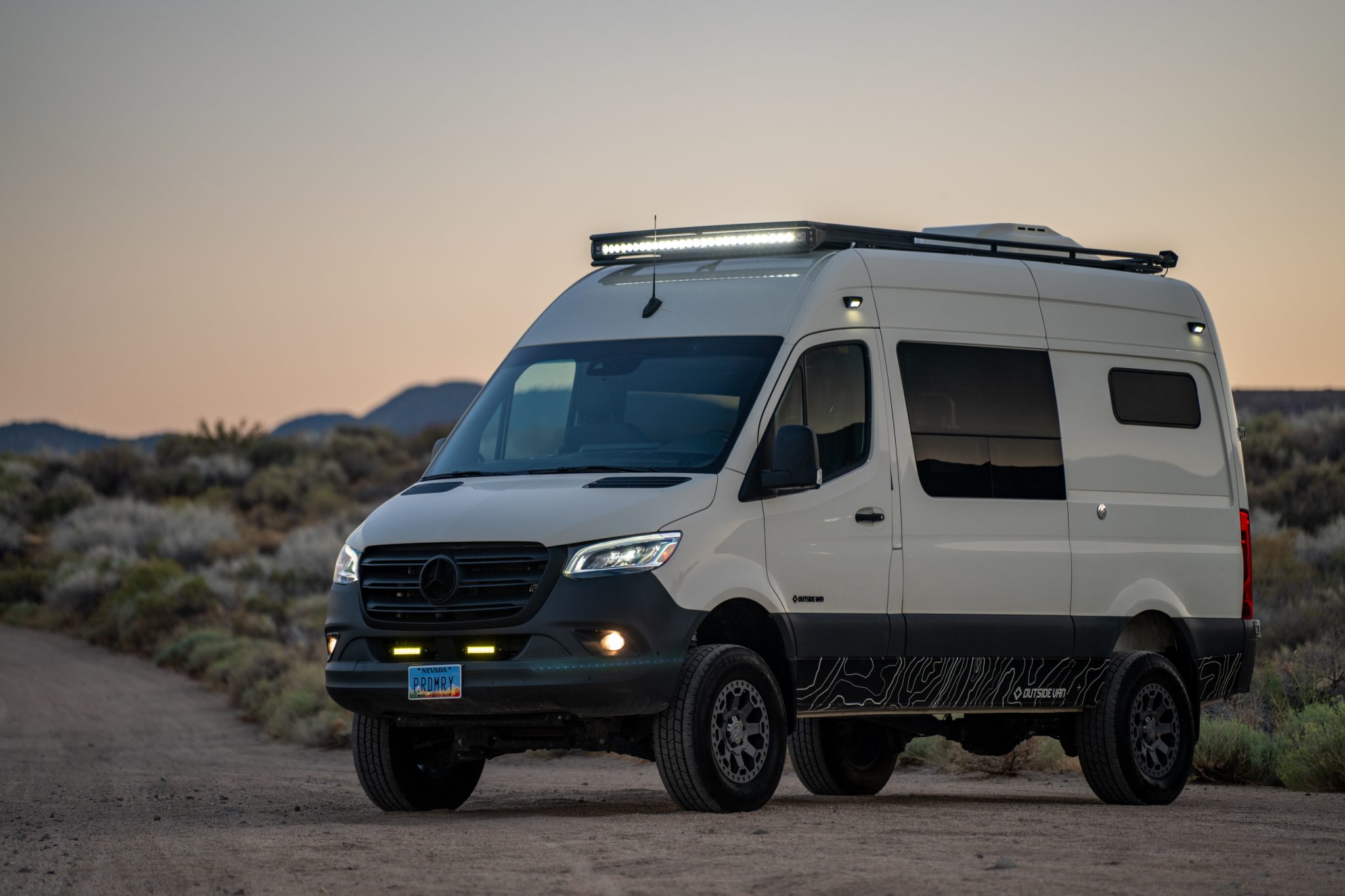 The 17″ Black Rhino wheels are mounted with 265/70 Back Country Touring H/T tires. A spare set of Black Rhino wheels with Cooper Discoverer Snow Claw tires is included in the sale. The suspension has been lifted with Agile front coilovers and Agile-tuned IFP rear shocks, and the van has also been fitted with Agile wheel spacers.
