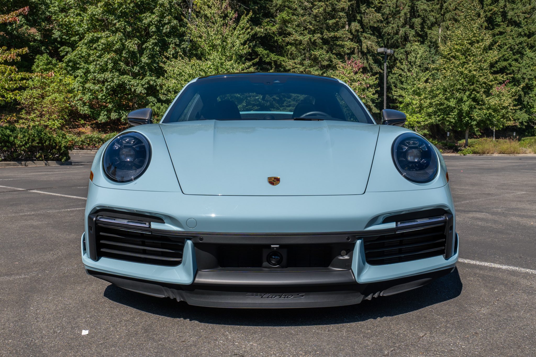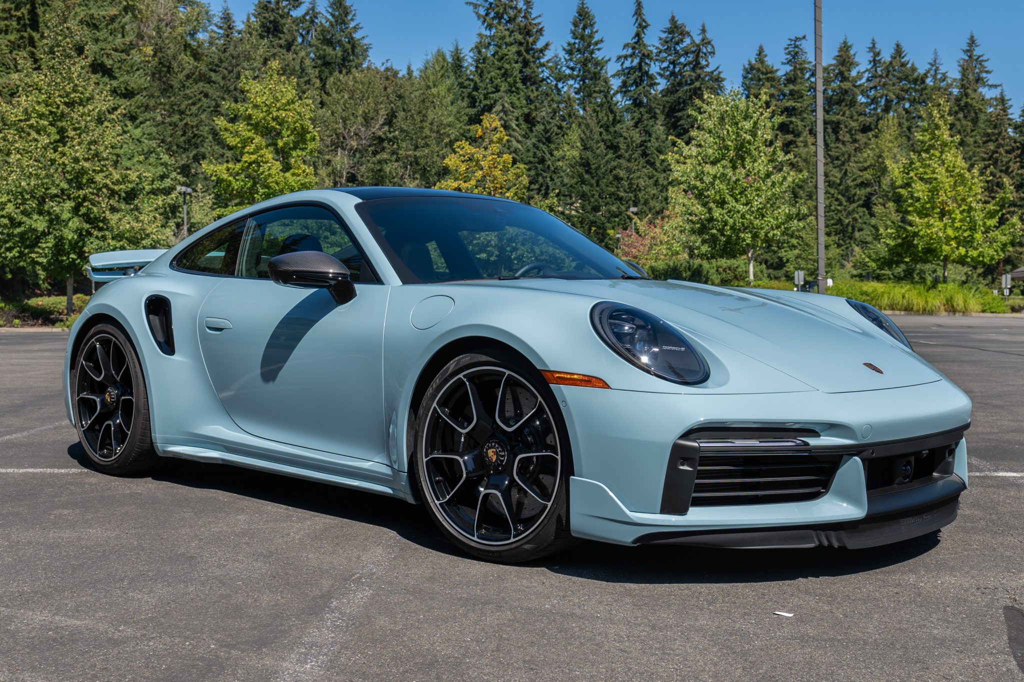 Center-locking 20″ and 21″ Turbo S Exclusive Design alloy wheels are mounted with Pirelli P Zero tires. Stopping power is provided by Porsche Ceramic Composite Brakes (PCCB) with black-finished multi-piston calipers. The car is equipped with a front-axle lift system, Power Steering Plus, rear-axle steering, and PASM sport suspension.