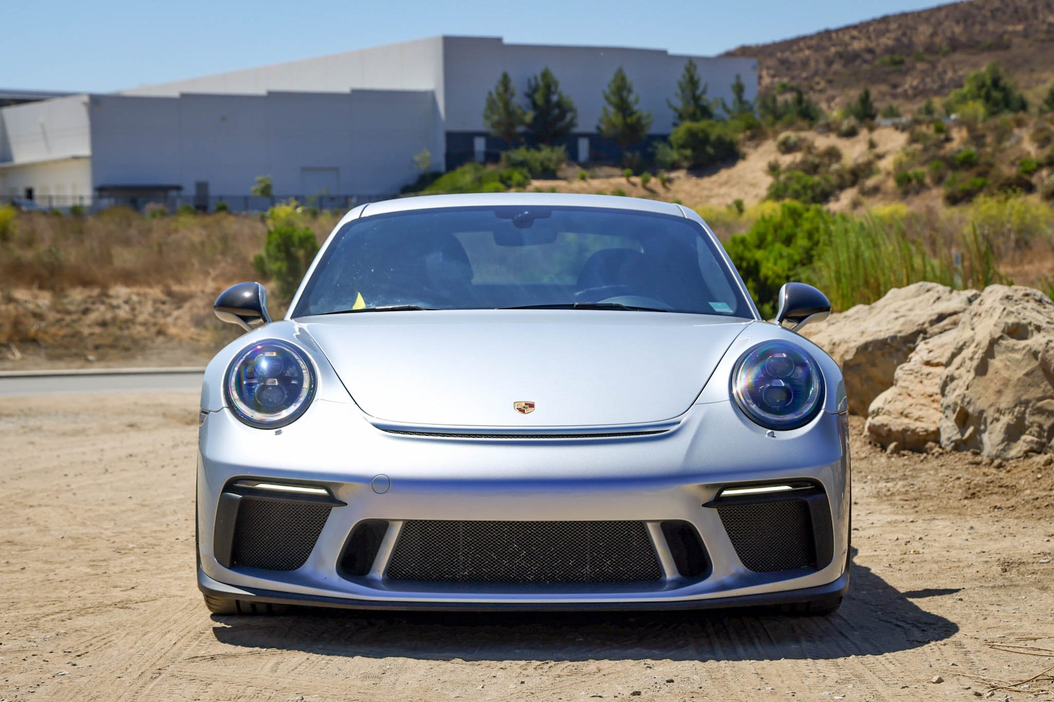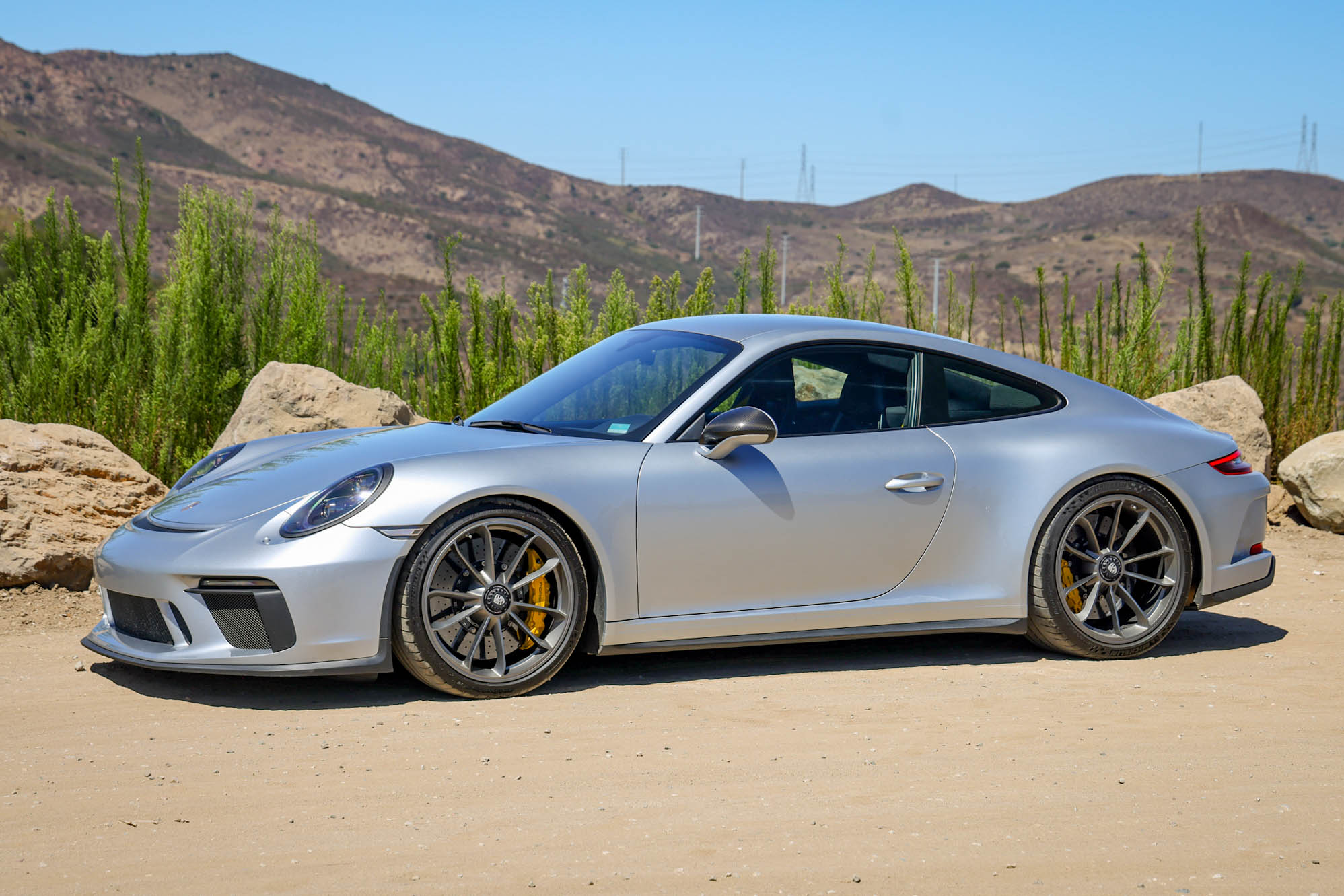 The 20″ center-lock alloy wheels are mounted with Michelin Pilot Sport Cup 2 tires. Braking is handled by gold Porsche-branded calipers over ceramic-composite rotors.