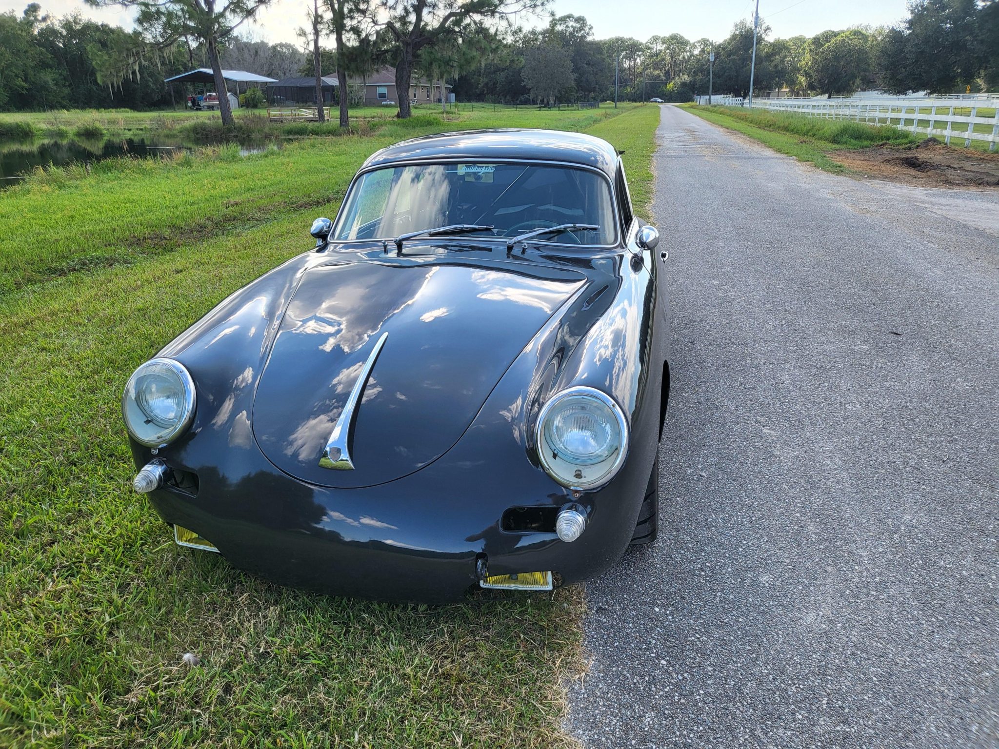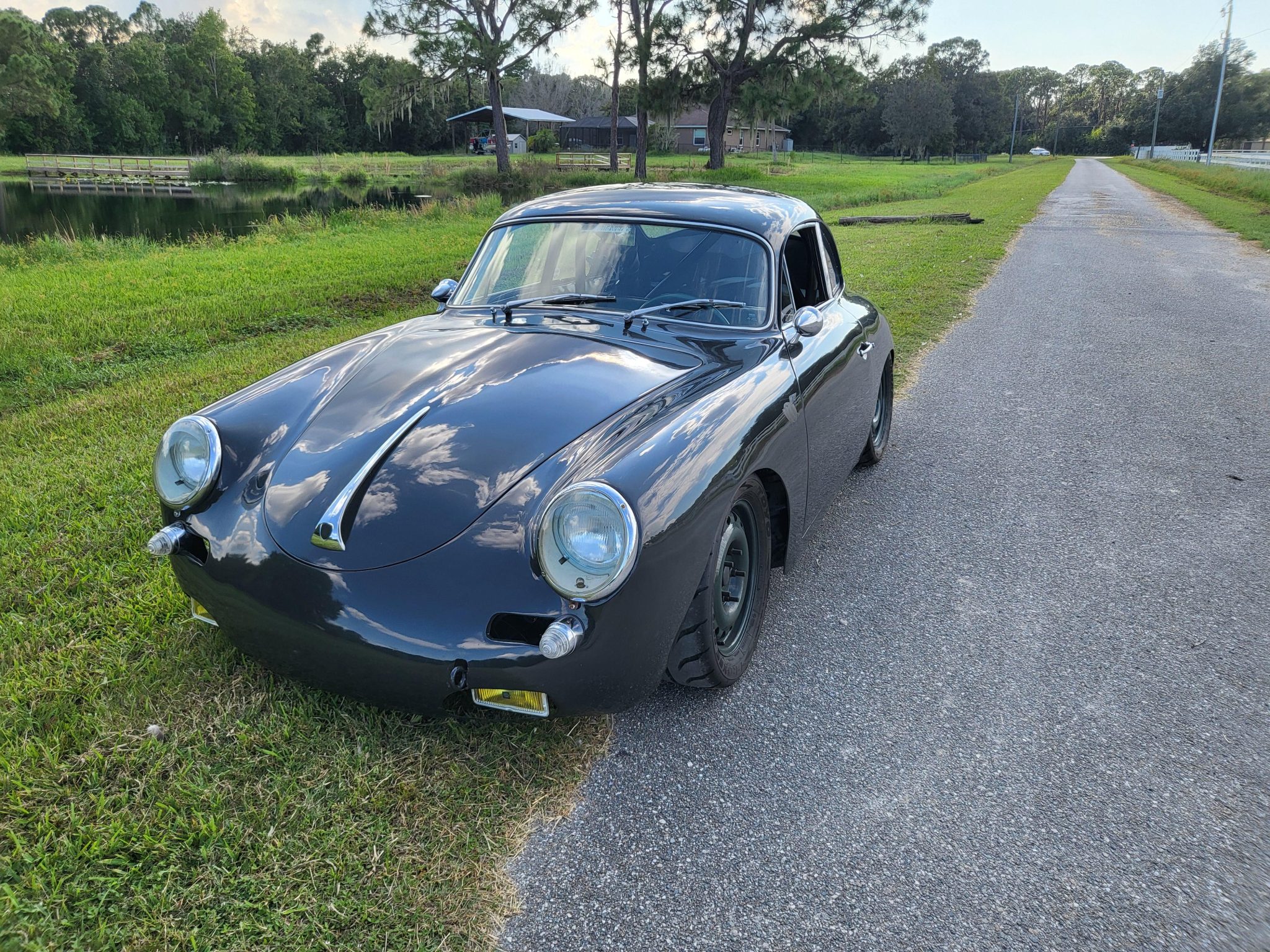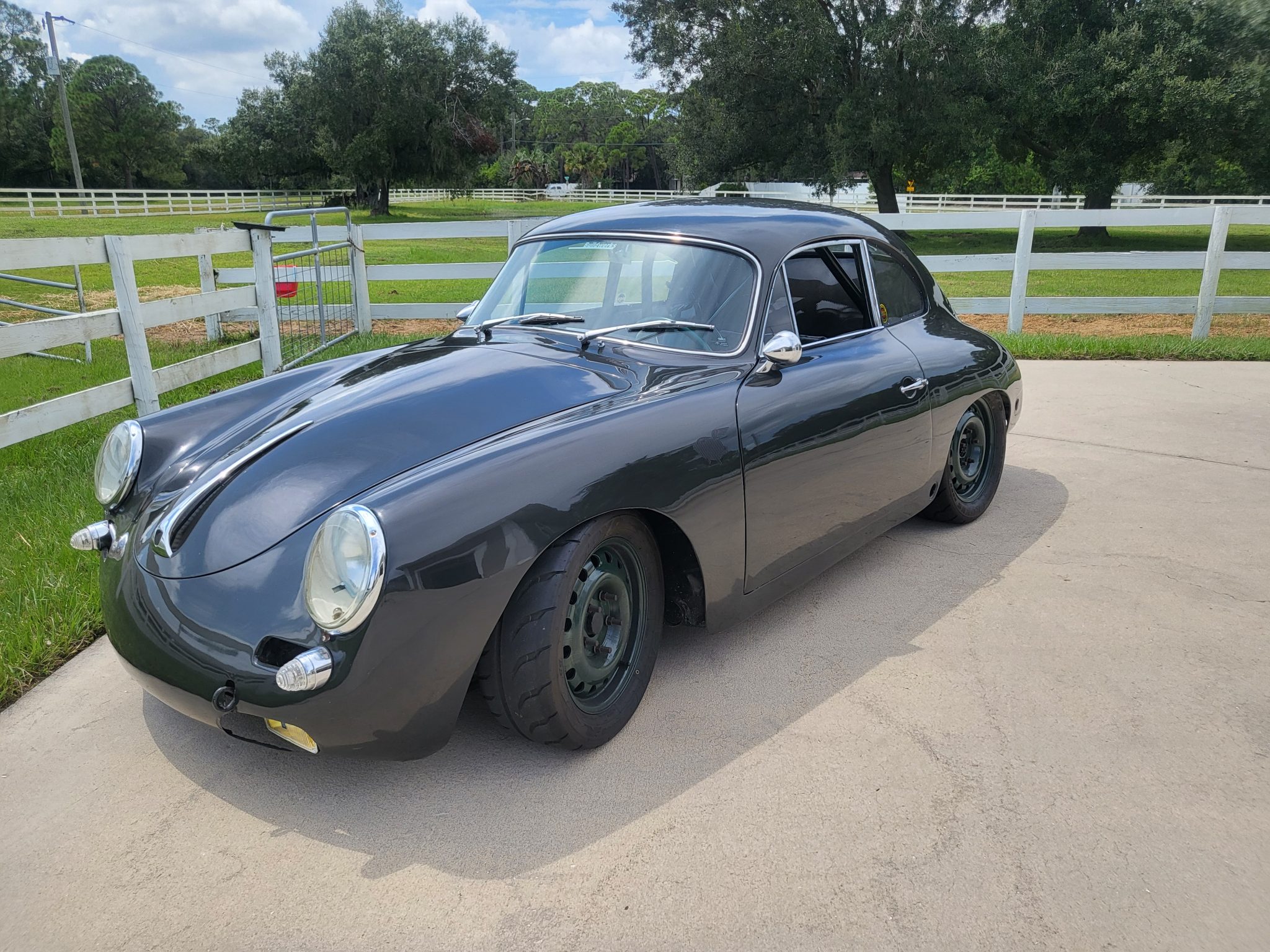 Green-finished 15″ steel Porsche space saver wheels are mounted with 205/60 Toyo Proxes R888 tires. Four wheel disc brakes have been added along with Bilstein shocks and a 356 Enterprises camber compensator.
