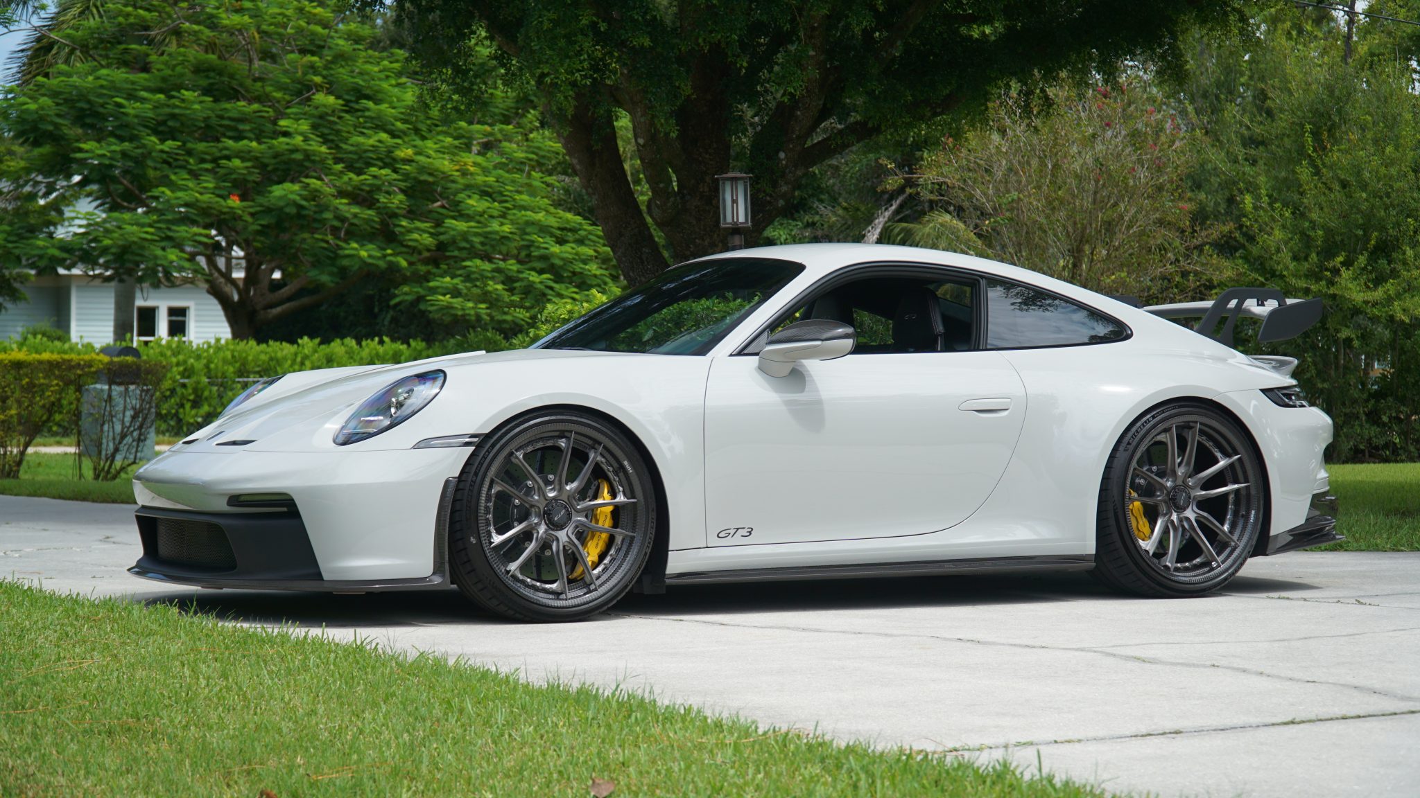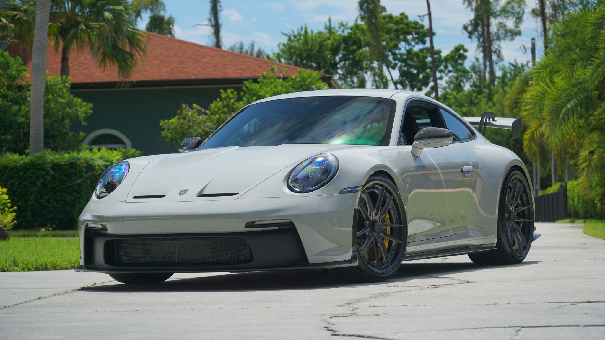 HRE HX105 carbon-fiber 21″ and 22″ center-lock wheels were mounted with Michelin Pilot Sport 4 S tires in 2023. The car is equipped with a front-axle lift system and rear-axle steering. Stopping power is provided by Porsche Ceramic Composite Brakes (PCCB) with yellow calipers over a cross-drilled and ventilated disc at each corner. A brake fluid flush was completed in October 2023.
