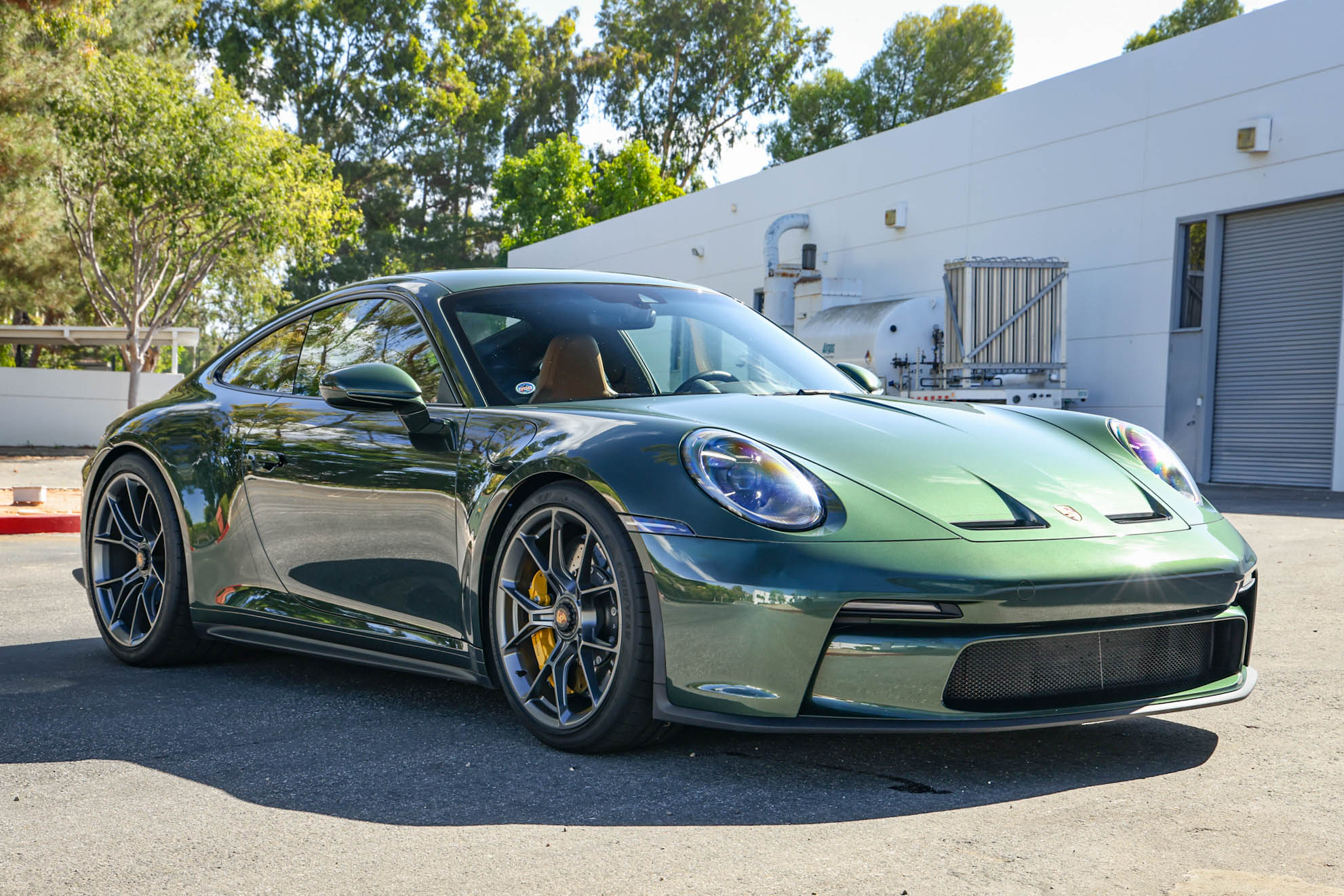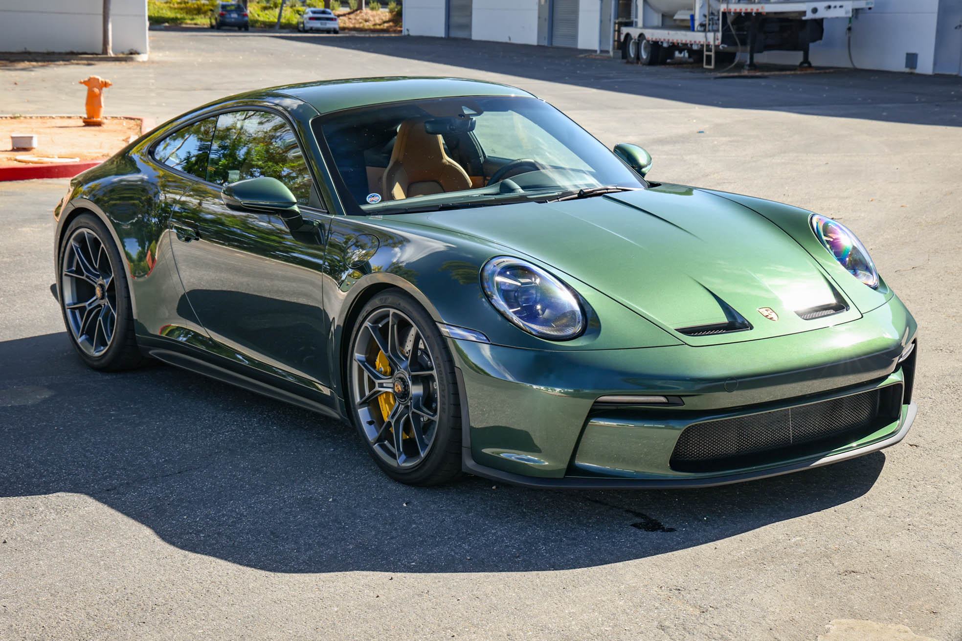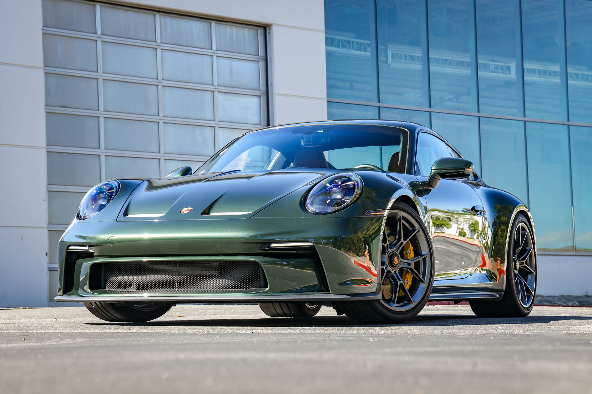 Satin Dark Silver-finished 20″ front and 21″ rear GT3 center-lock wheels are mounted with Goodyear Eagle F1 tires. Stopping power is provided by Porsche Ceramic Composite Brakes (PCCB) with yellow-finished calipers over cross-drilled and ventilated discs at each corner. The car is equipped with a front-axle lift system and rear-axle steering.