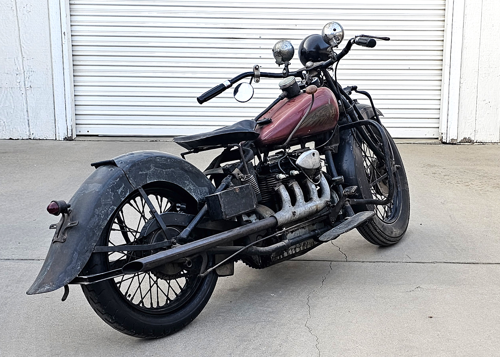 Black-painted 18″ wire-spoke wheels are laced to drum-brake hubs and were mounted with Firestone front and Continental Conti Blitz rear tires in 2024. The bike’s sole suspension consists of a leaf-spring trailing-link fork.