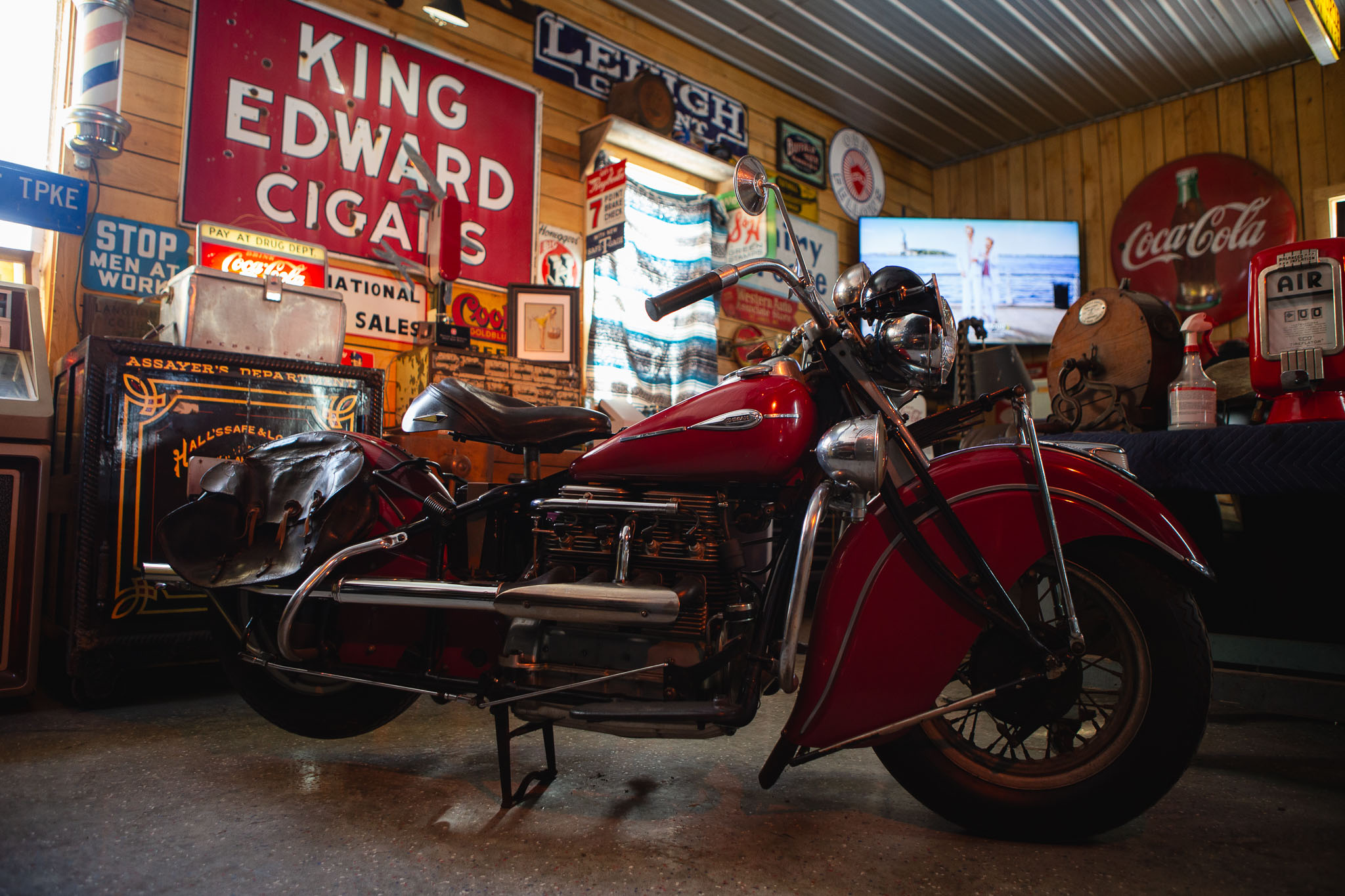 Silver-finished 16″ rims are laced to drum-brake hubs and mounted with Arco tires. Suspension consists of a leaf-spring trailing-link fork as well as a set of plunger shocks at the rear.