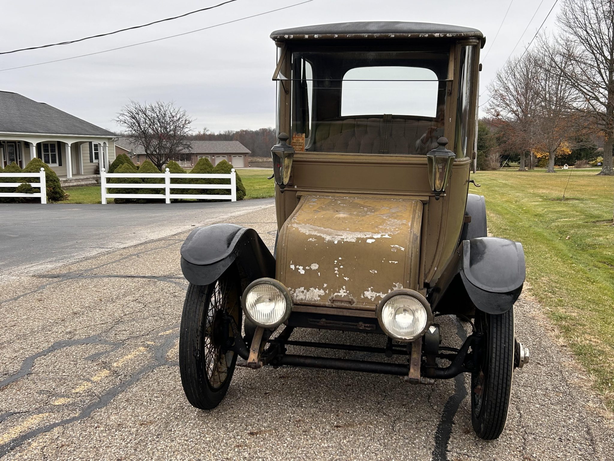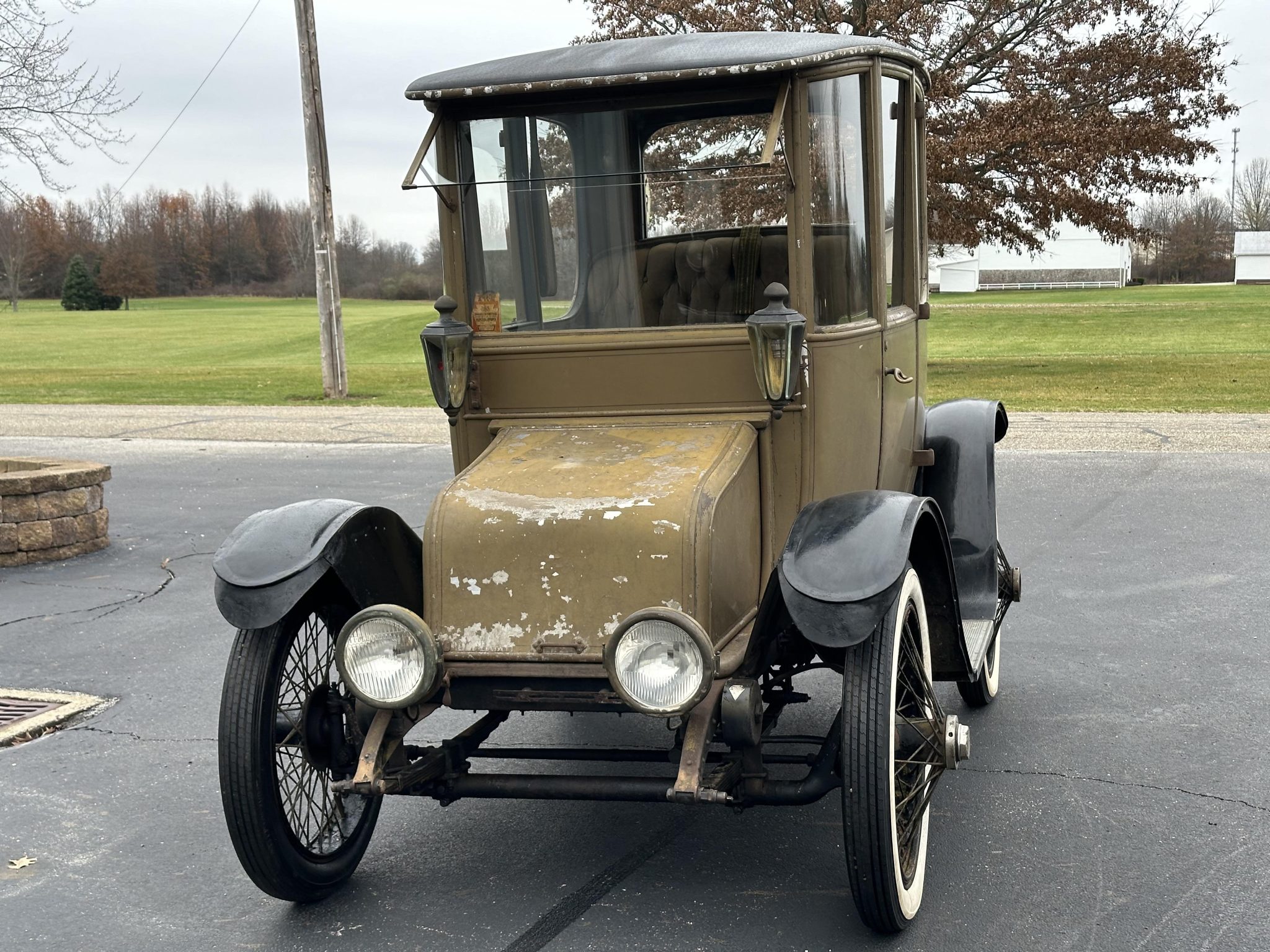 The wire-spoke wheels wear chipped black paint and Baker Electric-branded hubcaps, and they are mounted with older bias-ply whitewall tires. The left rear hubcap is missing. The Model DA rode on a 90″ wheelbase and featured live axles with leaf springs at all four corners. Rear mechanical drums are retained.