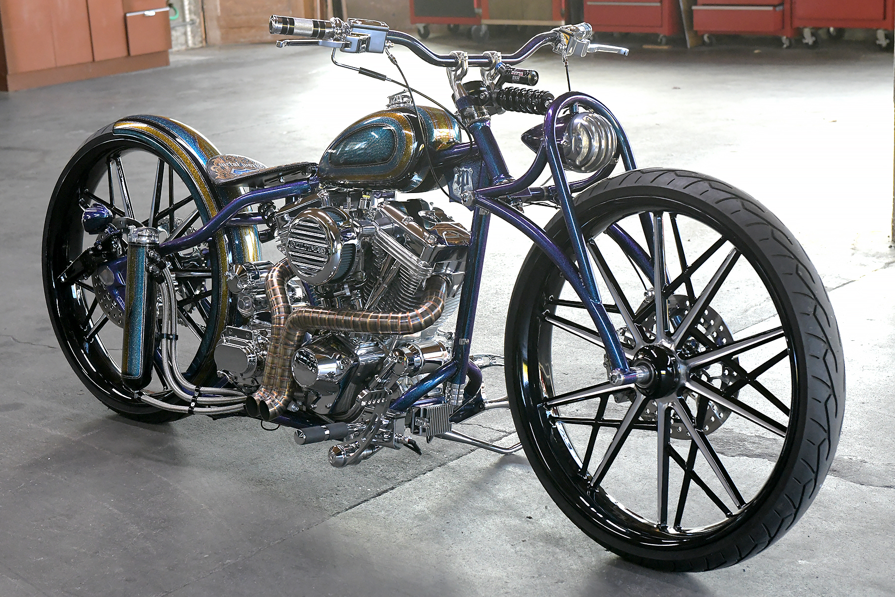 The paint colors are complemented by a hand-tooled black leather solo saddle from Juan Gonzalez of Nomad Custom Leather in Santa Ana, California. The front-hinged seat is supported by a single adjustable mini shock and bears gold scrollwork as well as the Aero Precision Metal Works logo. The bike is further equipped with billet forward foot controls, microphone-style headlight and taillight grilles, a side-mount vertical license plate holder, and a side stand.