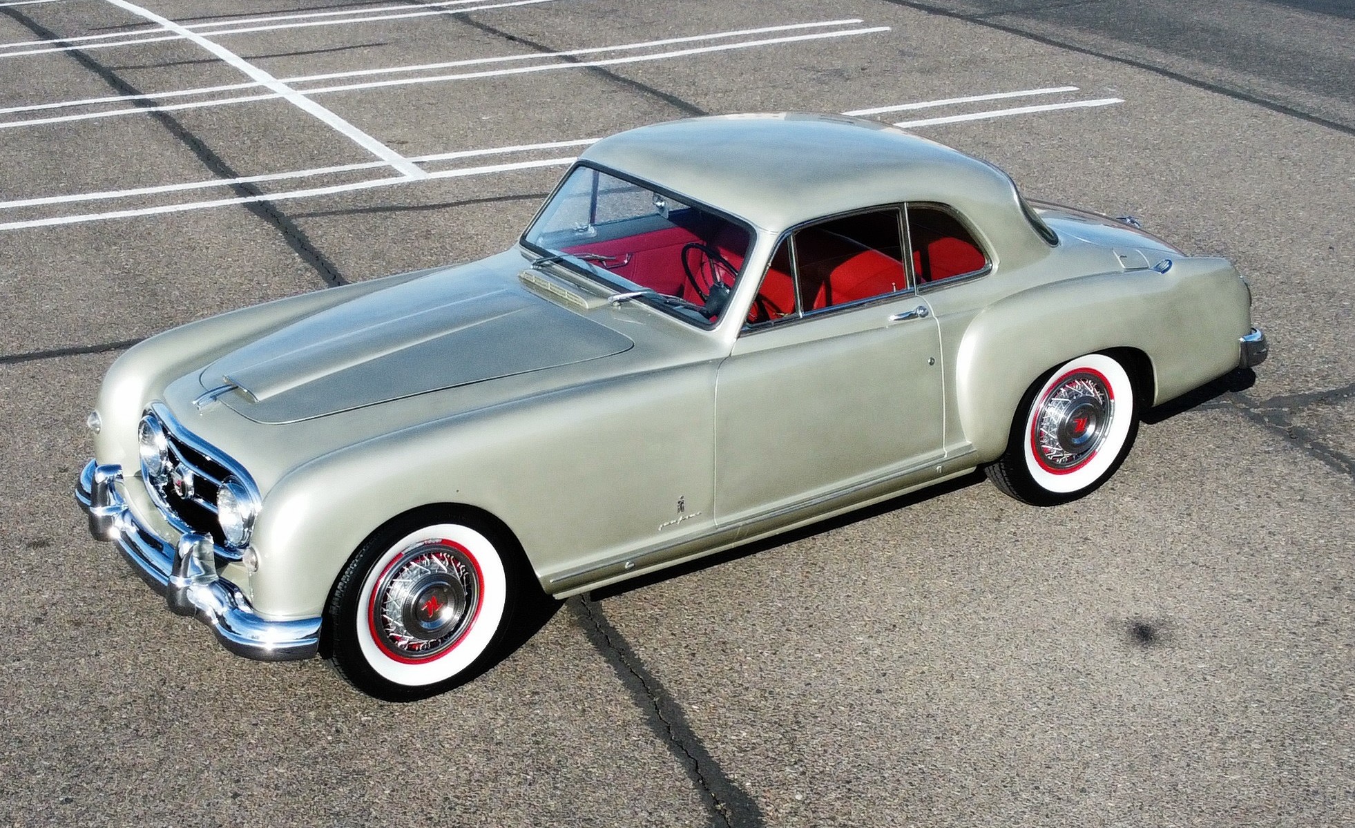 This example was repainted in platinum metallic under previous ownership and features headlights incorporated into the grille, a faux hood scoop, Pinin Farina fender badges, a single-piece rear window, tail fins, and chrome bumpers with overriders.