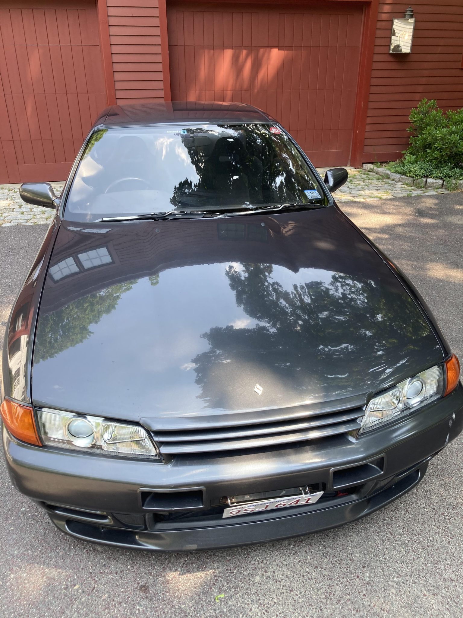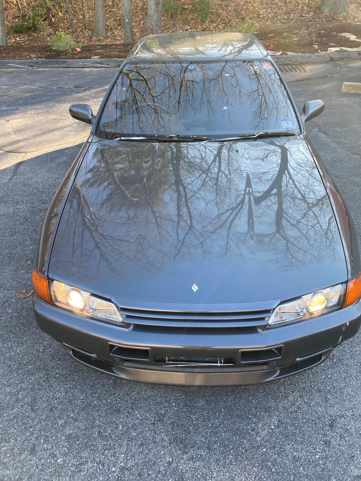 Zeit 17″ alloy wheels are wrapped in 255/40 Bridgestone Potenza RE01R tires showing 2019 production codes. The car is equipped with HICAS four-wheel steering, four-wheel anti-lock disc brakes with cross-drilled rotors, and an aftermarket strut tower brace. Curb rash is visible on the wheels in the gallery below.