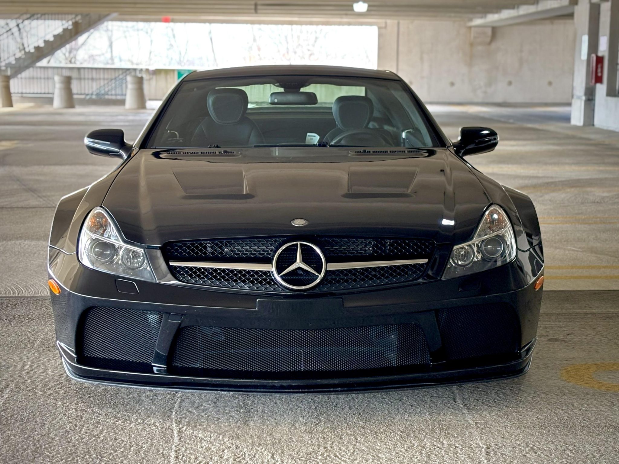 The forged 19″ and 20″ AMG twin-spoke alloy wheels are mounted with Dunlop SP Sport Maxx GT tires. The track is widened by 4.5” at the front and 4.1” at the rear compared to a standard SL65, and the car features an active-roll stabilization system and Electronic Stability Control. Stopping power is provided by silver AMG-branded calipers over slotted and cross-drilled rotors at all four corners.