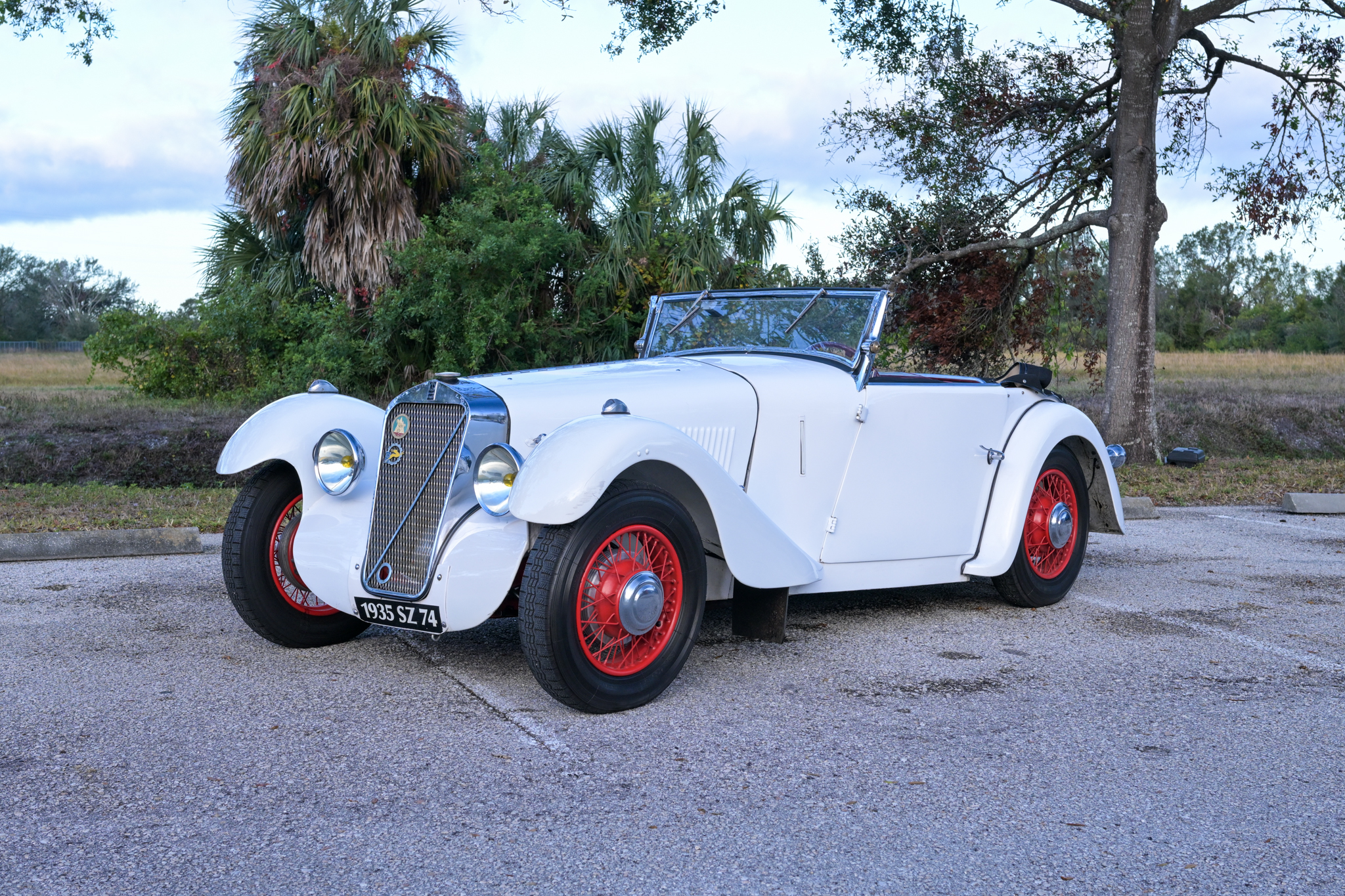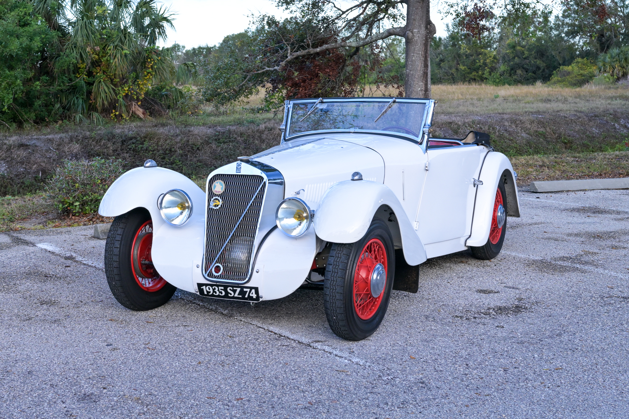 Chassis 1177 was refinished in white under current ownership and features a black soft top, a folding windscreen, a louvered hood, yellow headlight bulbs, grille medallions, and a rear-mounted spare tire with a black cover. The seller notes that the right-side trafficator does not illuminate, and damage on the left-front fender is shown up close in the gallery along with paint chips and blemishes around the car.