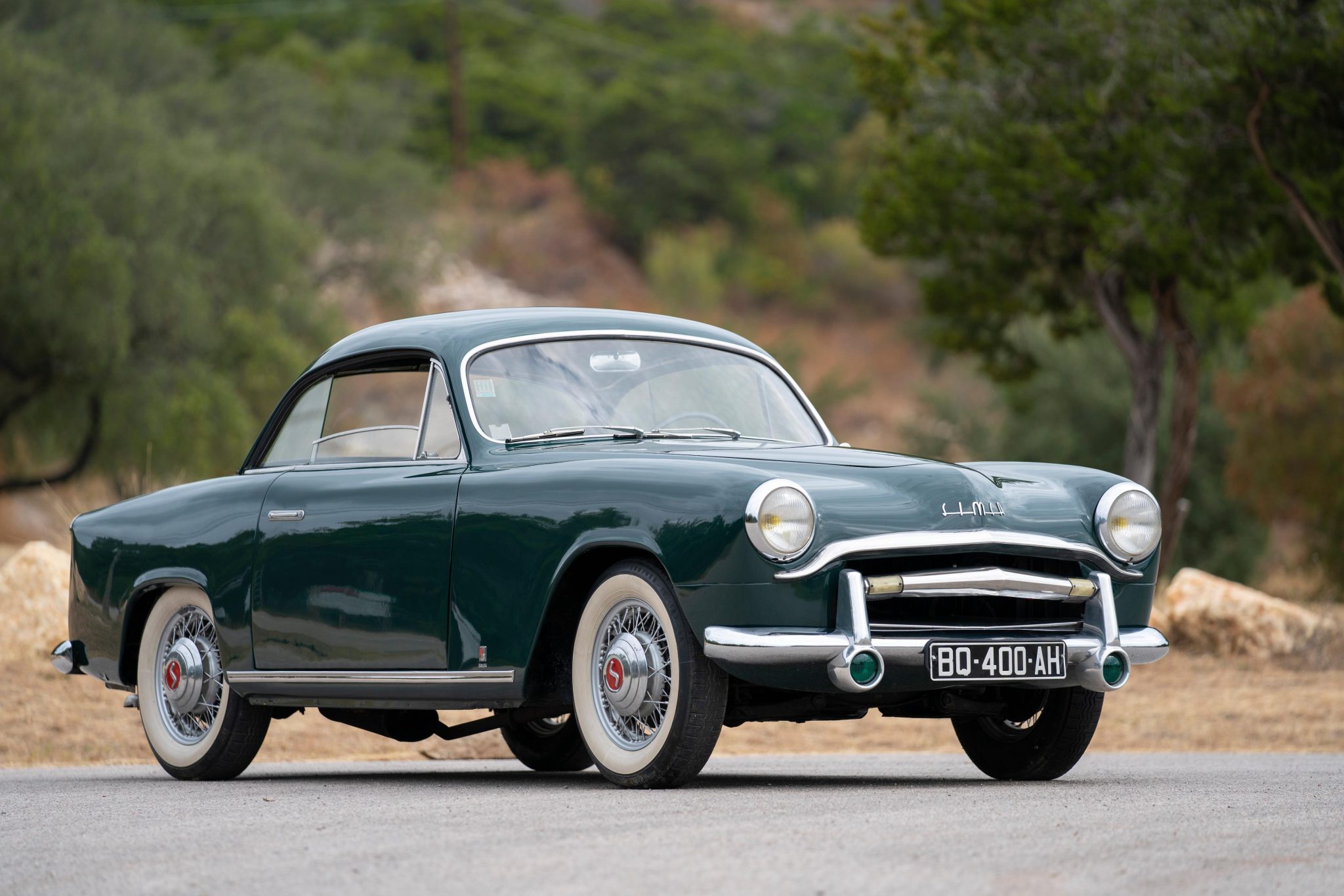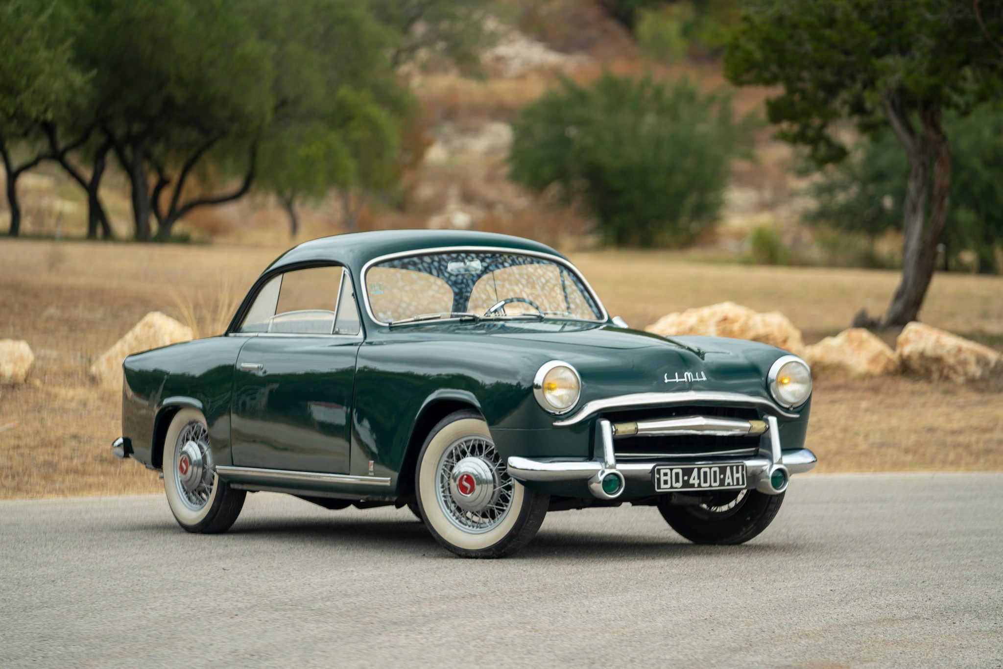 15” wire wheels wear polished hubcaps with red centers and “S” insignias, and Michelin wide-whitewall tires are mounted all around. The 9 Sport model shared the Aronde’s 2,440mm wheelbase, as well as its four-wheel hydraulic drum brake system. Additional exterior equipment includes yellow headlights, front fog lights with green lenses, and pivot-out door handles. Closeups of the finish, trim, and lenses are presented in the photo gallery below.