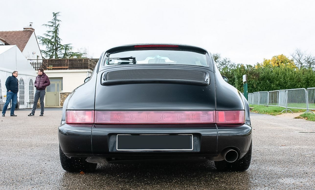 On the outside, this 964 is in very good condition. The paint, redone in the past, looks very good and shows no noticeable flaws except for a small trace of rubbing on the left front. A slight crack on the firewall is to be noted. The bodywork is free of dents, and no corrosion is to be reported except for a few spots on the front right and rear windshield bay. The exterior plastics and seals are in excellent condition. The car is equipped with a functional and waterproof electric sunroof. White turn signals and repeaters as well as a spoiler with 3rd brake light have been installed.