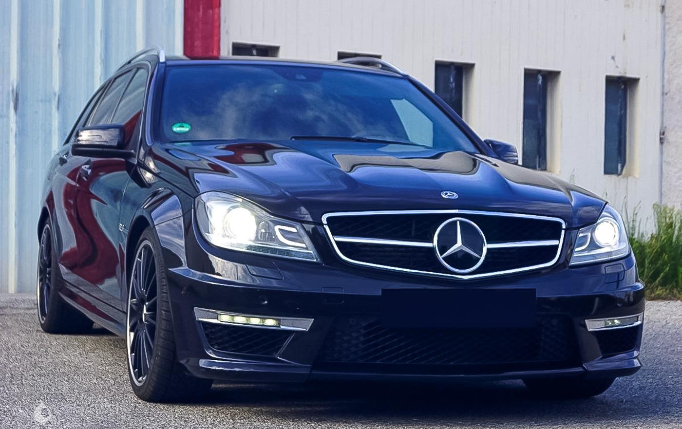 On the outside the car is in very good condition. The paint in its black tint has only very few defects visible in the gallery. The car will be polished for the sale. The exterior plastics and seals are in good condition, as are the headlights. The seller indicates that the chassis of this C63 AMG is sound. He also states that the car is fully original on the outside. It has the following equipment: