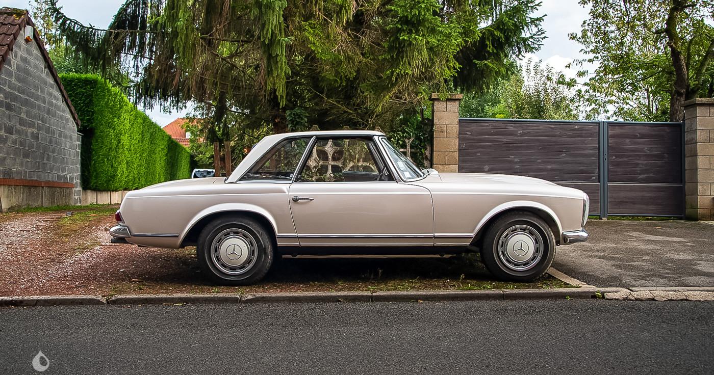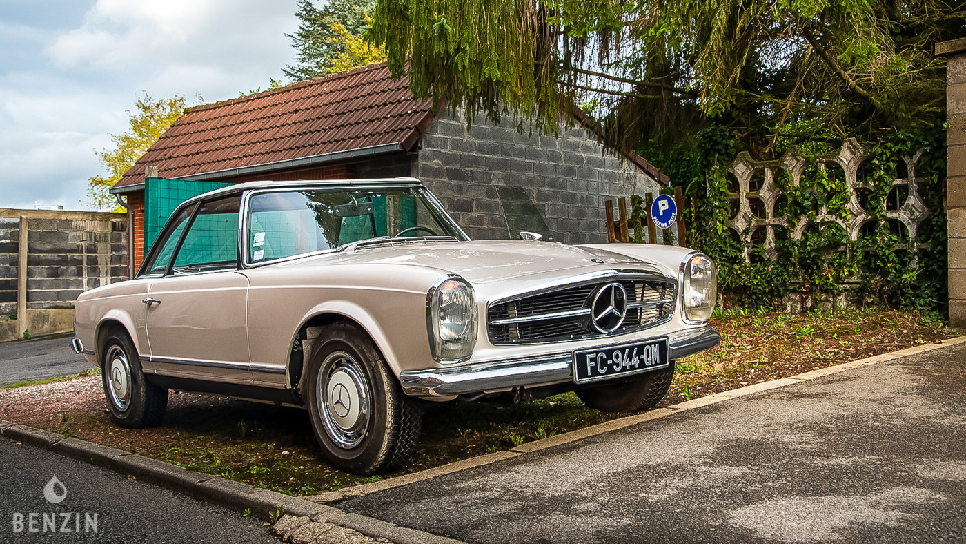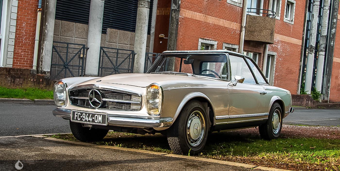 On the outside the car is in good condition. The paint in its white color has some visible defects in the gallery. There are a few dents, a deformation of the driver's side door panel and the beginning of corrosion on the trunk floor. The exterior plastics and gaskets are in good condition, as well as the headlights. The seller indicates that the chassis of this Pagoda is sound. The body was restored in 1996 (sandblasting / sheet metal treatment / painting and control of the body on marble). A lot of rods are new. The seller indicates that the hood is currently under repair, it will be new for the sale. The hood cover is missing. He also specifies that the car is fully original on the outside. The hard top is present.