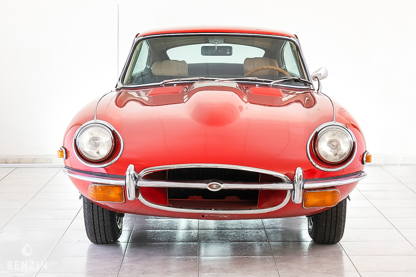 On the outside, this E-type is in very good condition. The paint in its "Signal red" color is very good and shows no noticeable defects. The exterior plastics and gaskets are in very good condition, as well as the windows and headlights. The seller indicates that the body and the chassis are sound. Corrosion is present near the battery and on the driver's side floors (see gallery). The car is fully original on the outside.