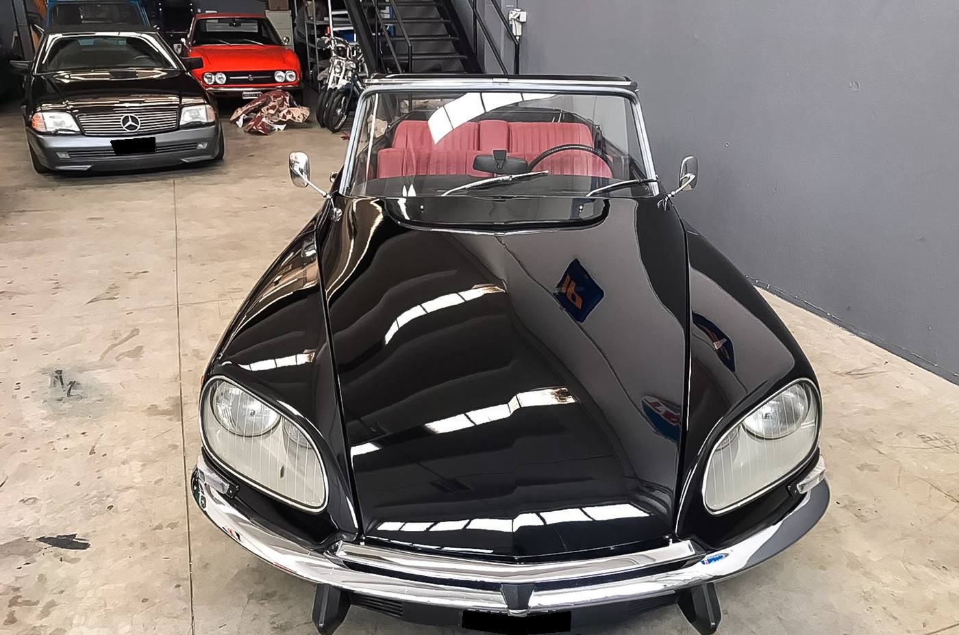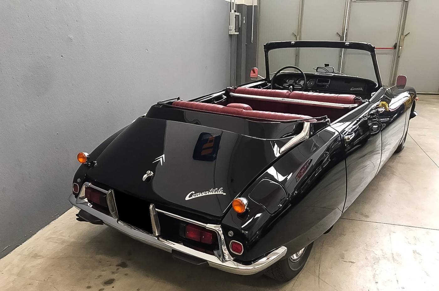 On the outside, the car is in very good condition. The paint in its black color looks very good and shows no noticeable defects. The bodywork is said to be free of corrosion and the joints and chromes are in very good condition, as are the headlights and the windows. The chassis is sound and for the conversion it has been reinforced with a steel structure. The central door posts have been reinforced and a chromed connecting tube joins them to stiffen the car. More details are available on the website of the body shop: http://www.vernagallo.it/en/citroen-ds-4-porte-cabriolet/