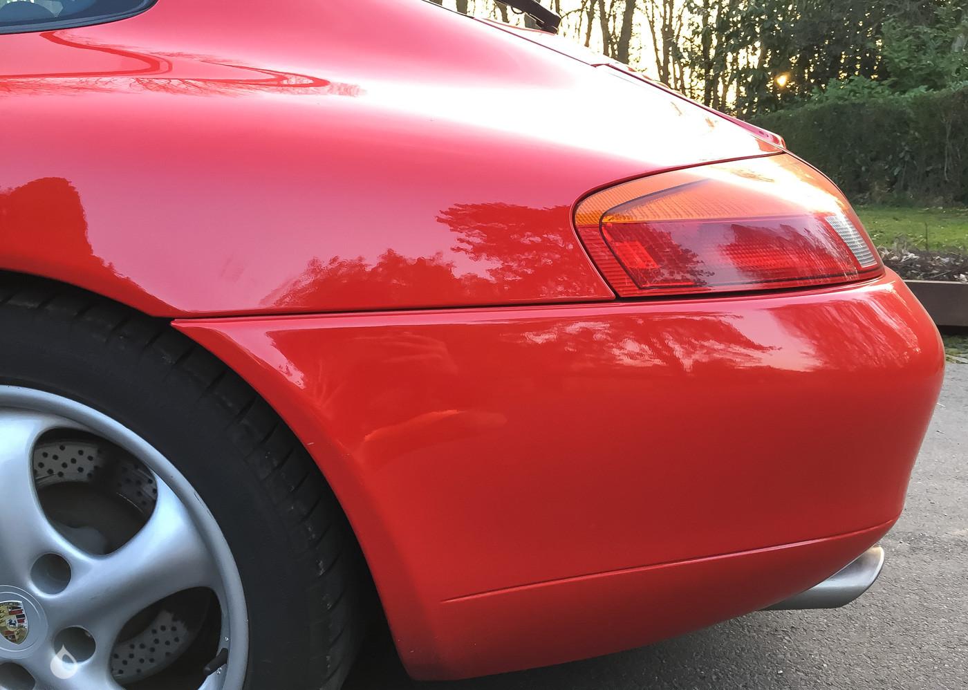 On the outside, the car is in very good condition. The paint in its red color has only very few defects visible in the gallery. We will note some gravel impacts on the hood. Plastics and exterior seals are in good condition, as well as the headlights. The engraving on the windows with the original license plate is still present. The seller indicates that this 996 is free of corrosion. He also specifies that the car is fully original on the outside.
