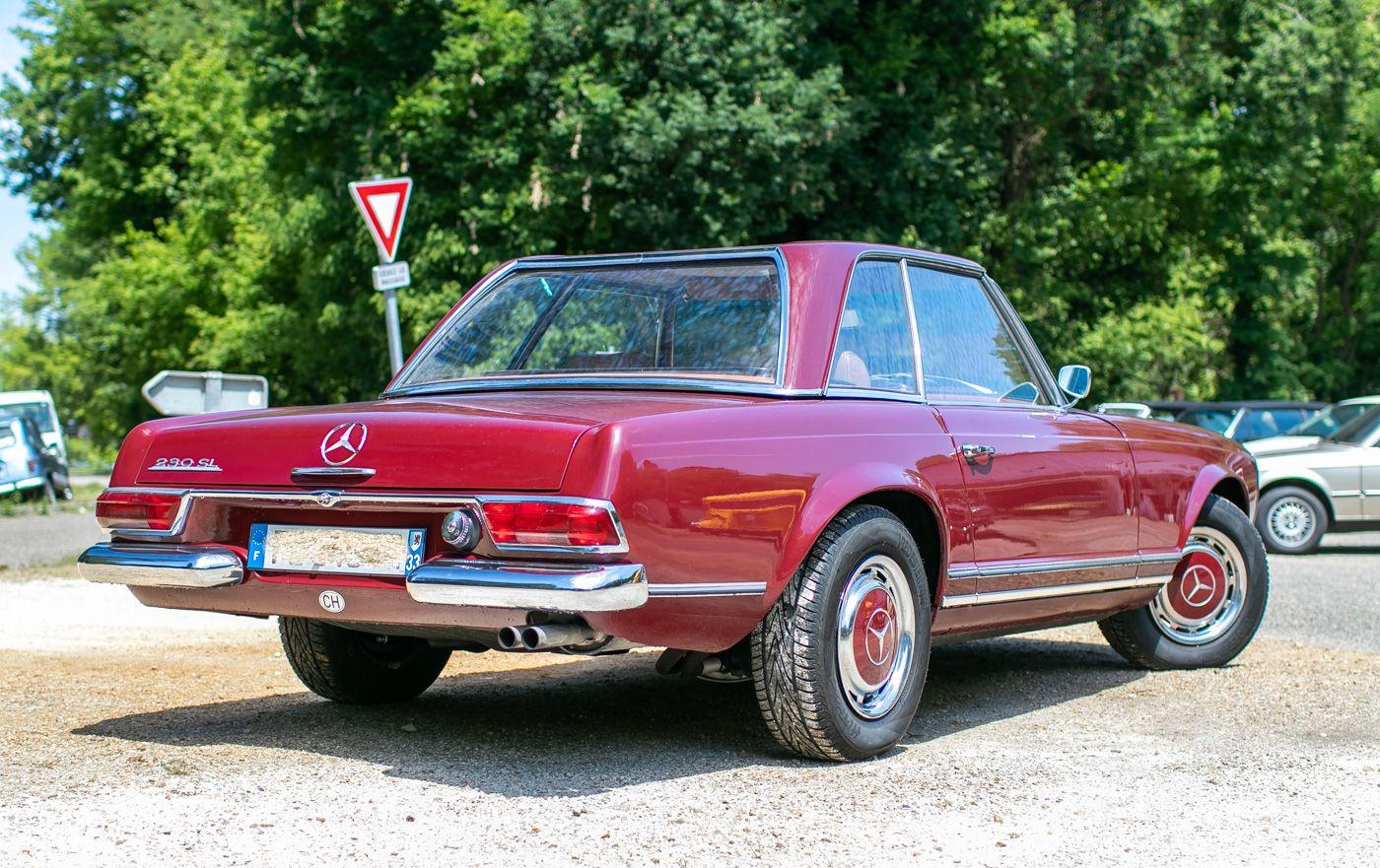 On the outside, the car is in very good condition. The bodywork has been repainted in a burgundy color during the restoration, it doesn't show any noticeable defects (see gallery). The exterior plastics and gaskets are in good condition, as well as the headlights. The driver door hinge and doorstop will be changed. The driver door will be repainted for sale. The hard top and windscreen are provided for sale. The seller states that this Pagoda is free of corrosion.