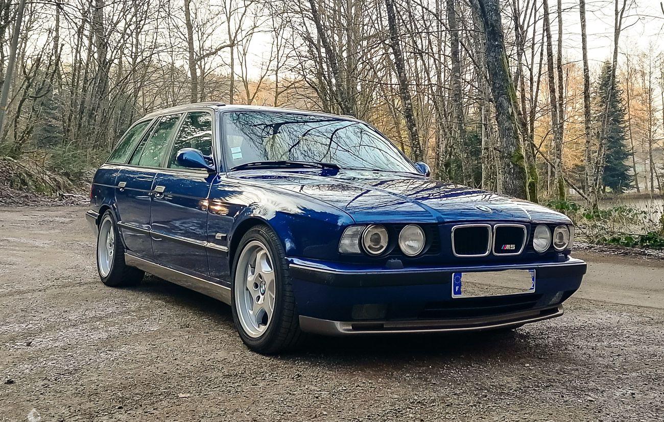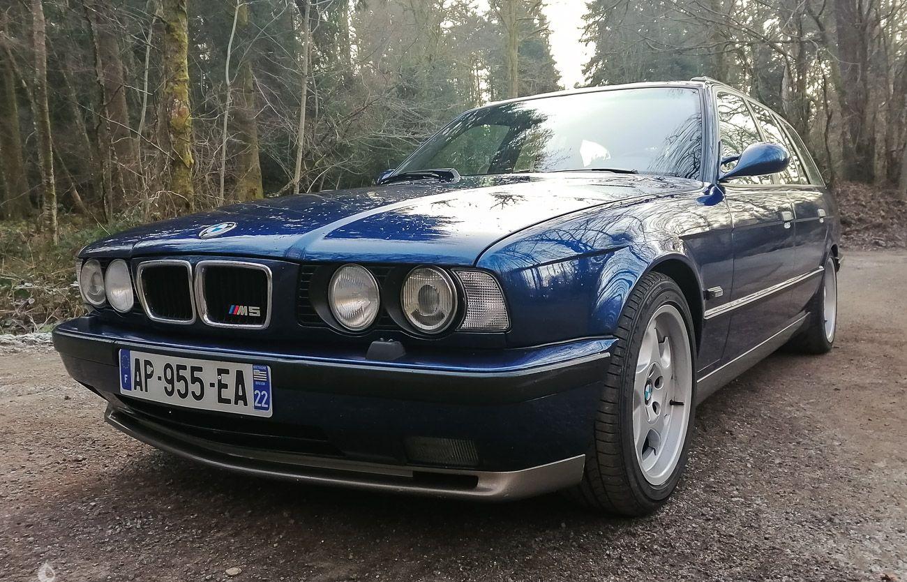 On the outside, the car is in very good condition. The paint in its Avus blue color (276M) has only a few visible defects in the gallery. The exterior plastics and seals are in good condition, as are the headlights. The seller indicates that the chassis of this M5 Touring is sound, pictures of the undercarriage are available in the gallery. The original turn signals are available.