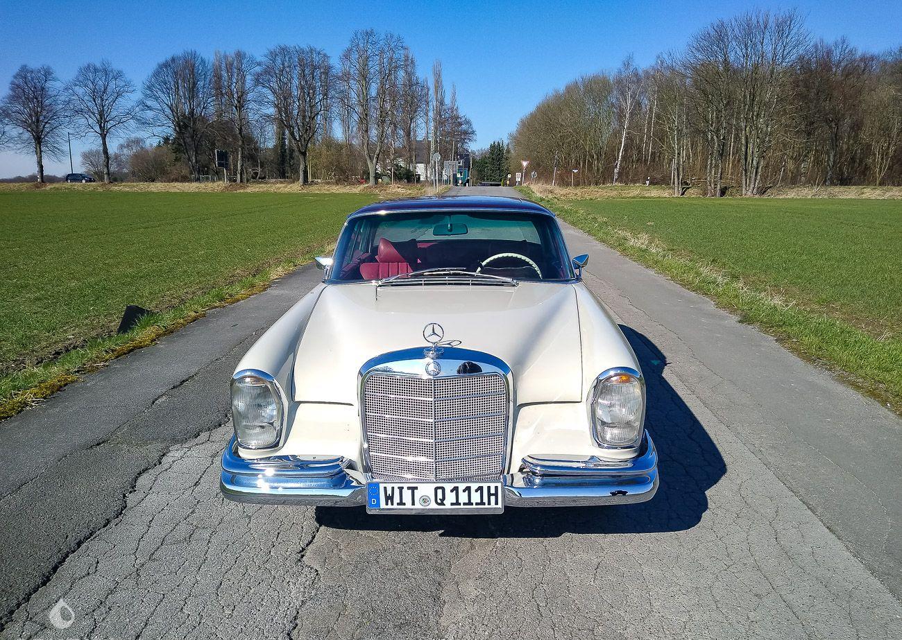 Externally, the car is in good condition. The cream and burgundy paintwork has a few visible flaws in the gallery. The two-tone paint was done with original Mercedes colors, reference DB158 for the body and DB542 for the roof. The exterior plastics are in good condition, as well as the headlights. The chrome parts have been renovated. The seller indicates that the window on the passenger side has some leaks. Pictures of the underbody are available in the gallery.