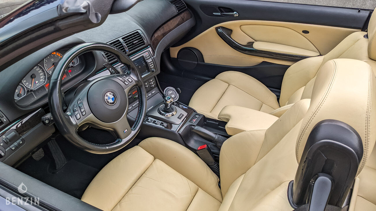 On the outside, the car is in good condition. The paint in its Nachtblau Metallic blue color has only a few visible flaws in the gallery. The seller notes a slight touch-up on a scratch on the passenger door and two marks on the bottom of the front bumper. The exterior plastics and seals are in good condition, as are the headlights. Pictures of the underbody are available in the gallery. The soft top is in good condition, waterproof and functional.