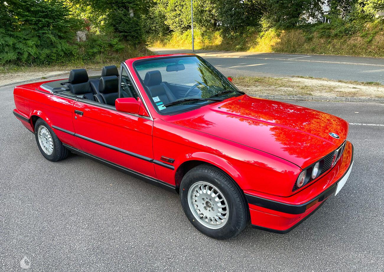 On the outside, the car is in good condition. The paint in its Brillantrot red color has only a few visible defects in the gallery. The exterior plastics and seals are in good condition except for the right rear window seal. The headlights are in good condition. Pictures of the underbody are available in the gallery. The soft top is in good condition and waterproof, the seller specifies that it works manually only.