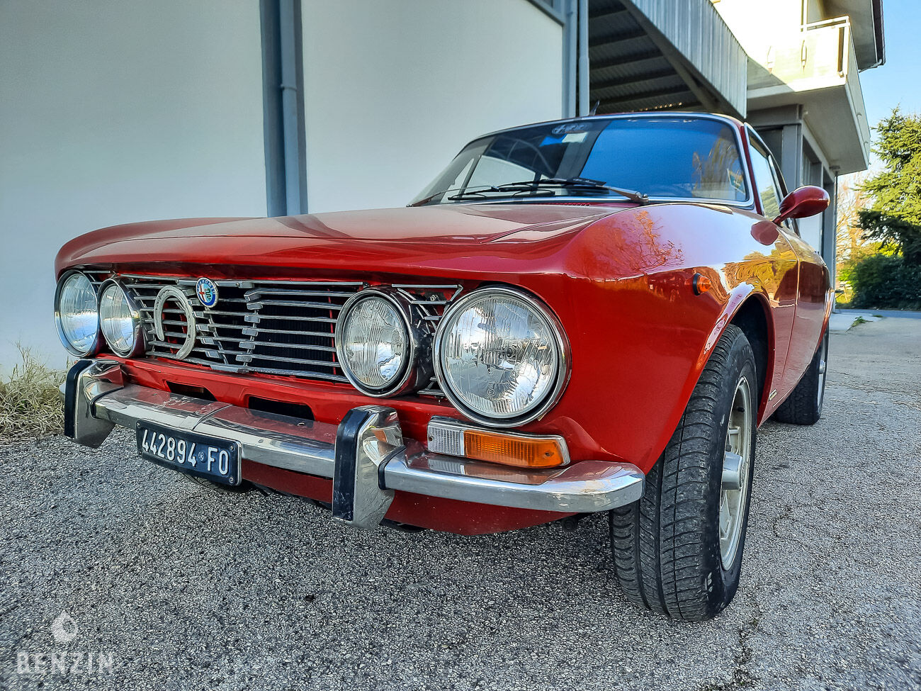 On the exterior, the seller states that the car is currently mounted in a "GT 1750" look. The paint in its red shade has a few flaws visible in the gallery. The chrome is in good condition, as are the headlights. Pictures of the undercarriage are available in the gallery. The seller specifies that he has the parts to reassemble the car in its original aspect (rear lights, grille, distinctive badge).