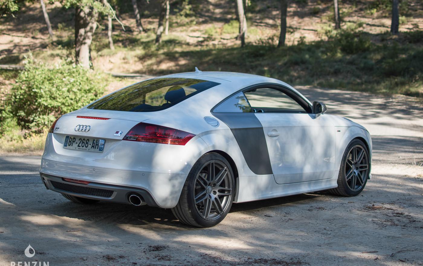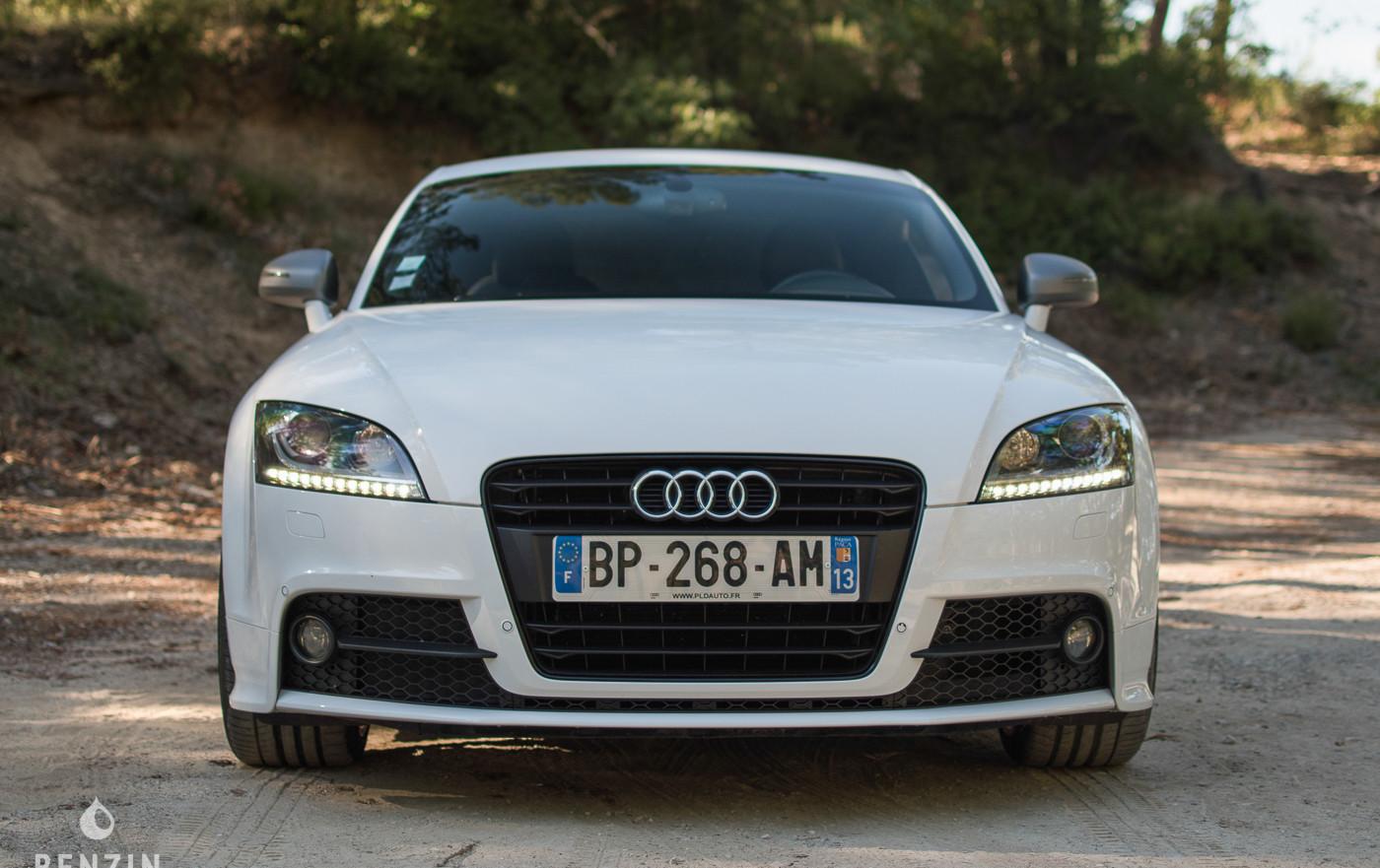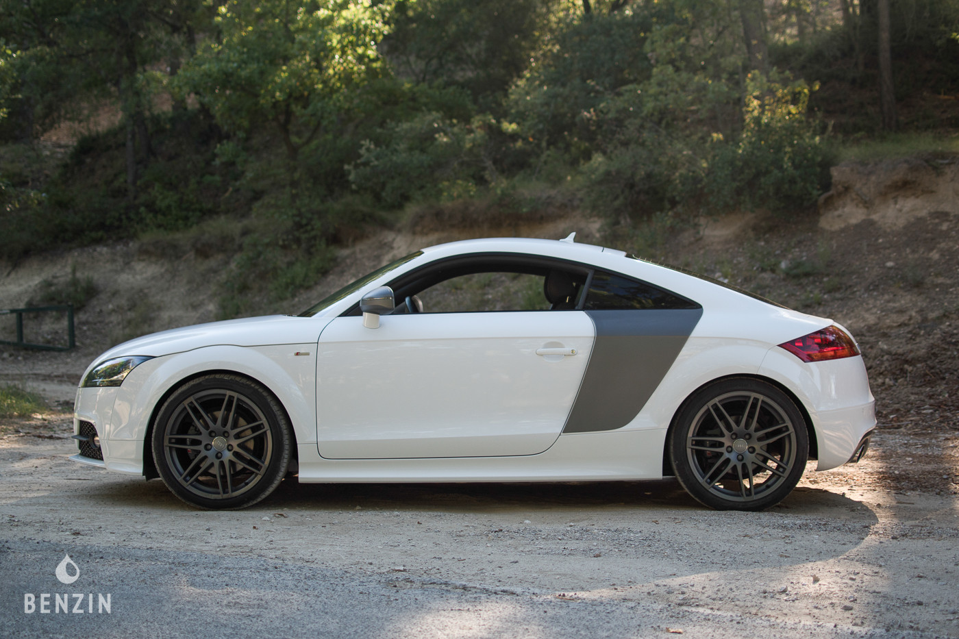 On the outside, the white paint shows no major flaws. The owner indicates that the car has been customized with an R8 kit from the Belgian company "Caractère". On the factory equipment side, this TT has the S-Line pack and the led pack.