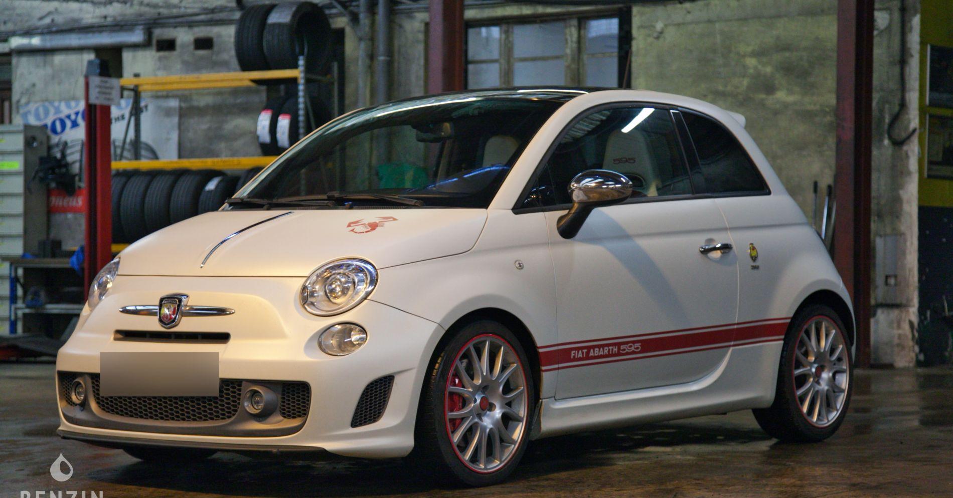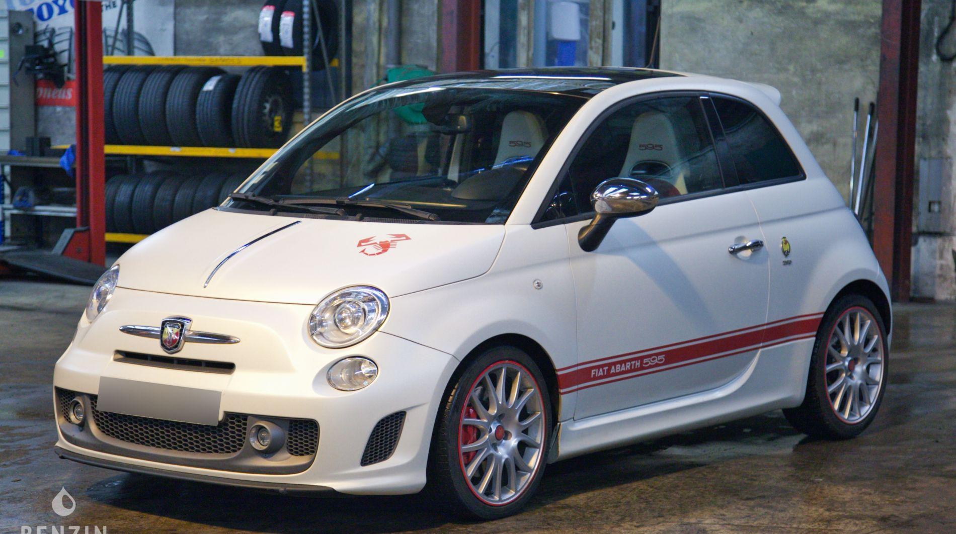 -single color: matt white-chrome mirror caps-17" wheels with red trim and 205/40 tires-Record Monza Dual Mode exhaust system with four outlets-red scorpion on front hood-Abarth" logos on rear fenders-Chrome "Fiat Abarth 595" logo on tailgate-red rocker panels with "Fiat Abarth 595" lettering-sport chassis and special shock absorbers-Brembo brakes with red calipers-electric sliding roof-Xenon headlights-rear spoiler