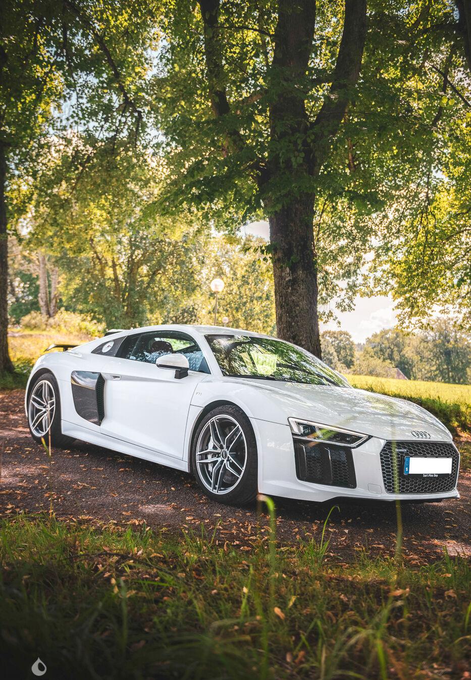 On the outside, the seller says that the vehicle is in good condition. The white bodywork shows only a few flaws, which can be seen in the gallery. This R8 comes with an exterior carbon pack.
