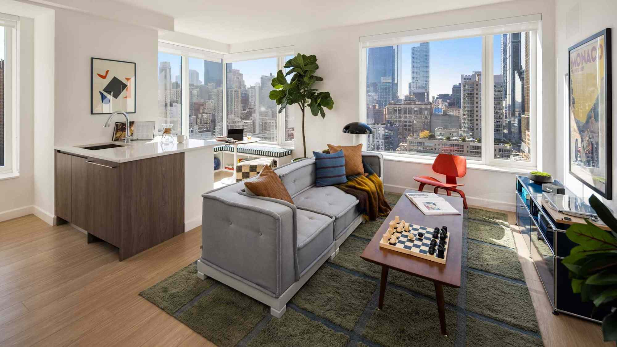 Elevate your living experience in this stunning brand new two-bedroom one-bathroom south facing corner apartment. This home offers breathtaking panoramic views of the city skyline and the Hudson River. Beautifully appointed with an L- shaped kitchen, light-filled living room and dual exposure, which frames a picture-perfect sunset. This home features ample sized winged bedrooms, that can accommodate king sized bed and more. Residence Features: -Expansive Windows -Complimentary Window Treatments -Central AC & Heat -In-Residence Washer & Dryer -Paneled Appliance Suite -Luxury Plank Flooring -Smart Entry Lock Live in full bloom through a host of amenities and lifestyle services. This building offers over 20,000 square feet of inspired indoor and outdoor amenities paired with incomparable lifestyle services. Enjoy access to a rooftop terrace with stunning Manhattan views, an upscale sky lounge, collaborative co-working spaces, and a state-of-the-art fitness club. The dedicated concierge team complements the amenity suite by offering a selection of unique events and programming, enabling residents to cultivate a rich lifestyle. Building Amenities: 24-hour Attended Lobby; Gotham Living: Dedicated Concierge, Lifestyle Services, Curated Events; 46th Floor Rooftop Sky Lounge with Wet Bar; 46th Floor Sundeck with Landscaped Lounge Area & Outdoor Shower; 8th Floor with BBQs, Landscaped Seating Areas, & Outdoor TV; 8th Floor Resident Lounge & Co-working Space with Conference Rooms, Phone Booth, & Work from Home Pods; State-of-the-art Fitness Club with Yoga Studio & ; 4th Floor Resident Lounge & Co-working Space; Package Room with Cold Storage; Resident & Bicycle Storage; Common Laundry Room; Pet Spa; Live in full bloom through a host of amenities and lifestyle services. This building offers over 20,000 square feet of inspired indoor and outdoor amenities paired with incomparable lifestyle services. Enjoy access to a rooftop terrace with stunning Manhattan views, an upscale sky lounge, collaborative co-working spaces, and a state-of-the-art fitness club. The dedicated concierge team complements the amenity suite by offering a selection of unique events and programming, enabling residents to cultivate a rich lifestyle. Building Amenities: 24-hour Attended Lobby; Gotham Living: Dedicated Concierge, Lifestyle Services, Curated Events; 46th Floor Rooftop Sky Lounge with Wet Bar; 46th Floor Sundeck with Landscaped Lounge Area & Outdoor Shower; 8th Floor with BBQs, Landscaped Seating Areas, & Outdoor TV; 8th Floor Resident Lounge & Co-working Space with Conference Rooms, Phone Booth, & Work from Home Pods; State-of-the-art Fitness Club with Yoga Studio & ; 4th Floor Resident Lounge & Co-working Space; Package Room with Cold Storage; Resident & Bicycle Storage; Common Laundry Room; Pet Spa;