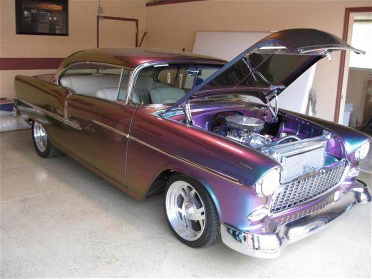 1955 Chevrolet Bel Air powered by a GM 400ci V-8 engine with a B&M Supercharger. Mated to a 700 R-4 Auto Transmission. Includes A/C, power steering, power brakes (Front: disc; Rear: drum). This car has an amazing and eye-catching custom Chameleon colored paint job, which includes inside engine compartment, trunk and the undercarriage of the car. Michelin tires wrap around the polished aluminum Budnick Wheels. Extensive chrome and polished Aluminum throughout entire car. Shaved doors, hood and trunk provide a clean look down the side and rear of the car.
