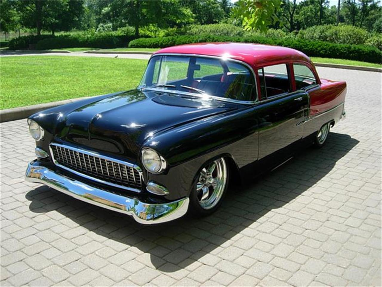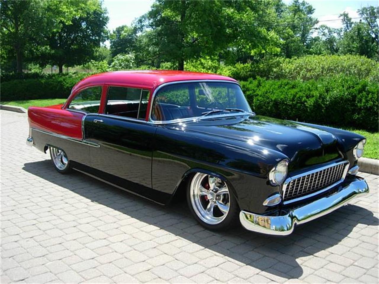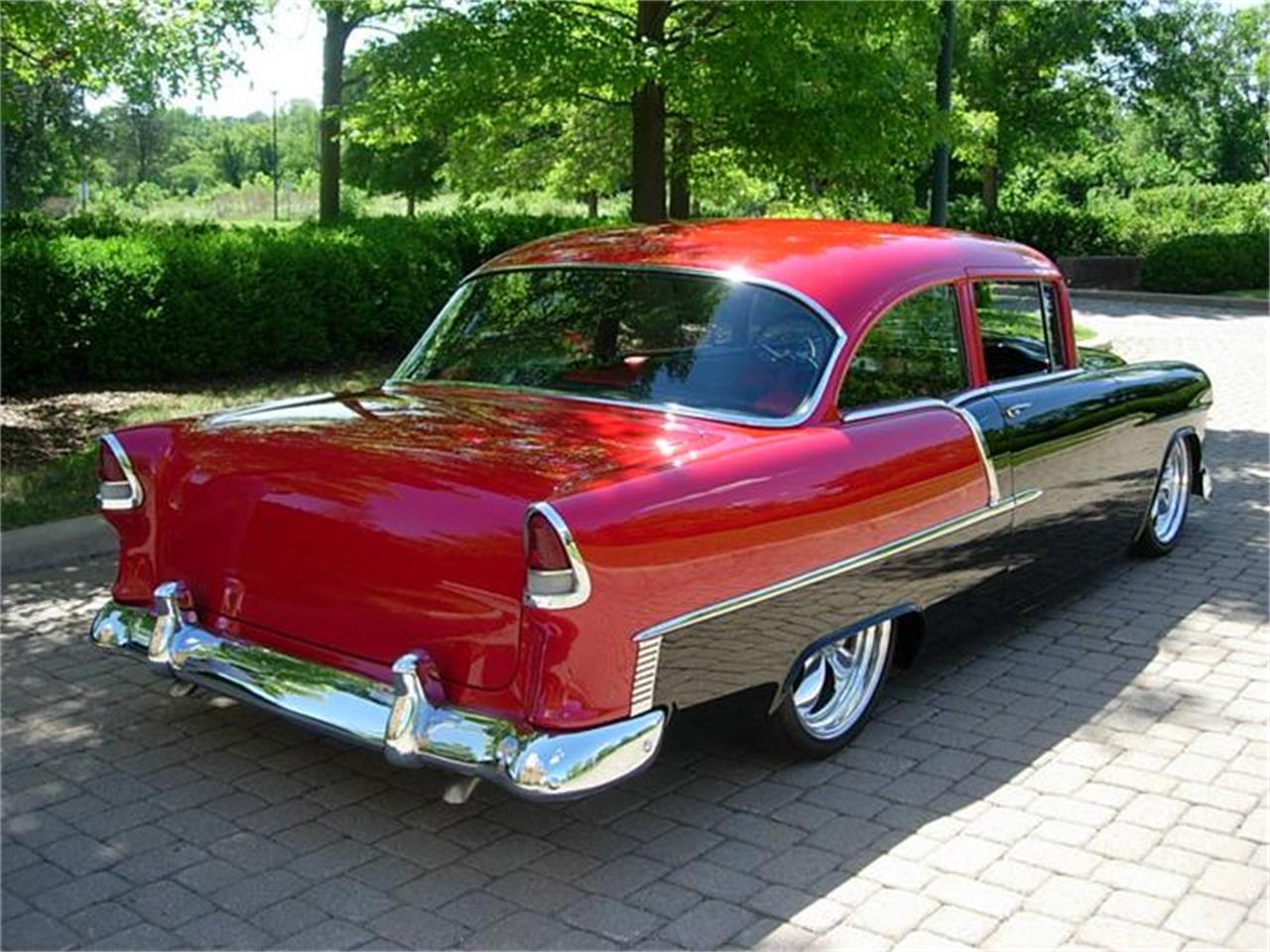 Outstanding Chevy 210 Resto Mod finished on a perfectly straight body in Black and Red two tone paint. The engine is a Chevy 496 big block chromed and finished to perfection from top to bottom with a special crank developing 550 h.p., Aluminum heads, Dome 100 pistons, stainless valves, 2.250 intake, 1.880 exhaust. Sealpower cam with 576 lift/304 duration and 3/8 push rods. Smelling hv pump, double roller timing chain, 750 Berry Grant carb., Air gap intake, Crane roller rockers, Clevit 77 bearings, Felpro gaskets and a high volume water pump. Griffin polished radiator and condenser and Billet serpentine pulley system finish off the engine. Power is distributed thru a built 350 trans. with a Stahl 2800 converter, 9” Ford rear with 355 gears. Mandrel bent 2 1/2” stainless exhaust, Heidt’s tubular A arms, 4 link rear, convertible X member are on a smoothed frame. The just right stance comes from coil over suspension on all four corners. Interior features include Red and Black leather seats accented with Black carpeting, trunk finished in Black leather and carpeting, Vintage A/C, heat, Classic gauges, Alpine Stereo with double mps., switches, power front windows, Flaming River tilt column and Painless wiring. Stopping is made easy with big Wilwood disc brakes with slotted cross drilled rotors and master cylinder. Dual optima batteries make starting easy every time with hidden battery disconnect and outside jumper posts.