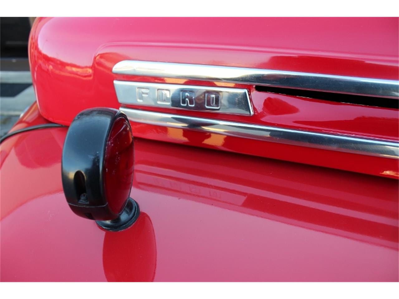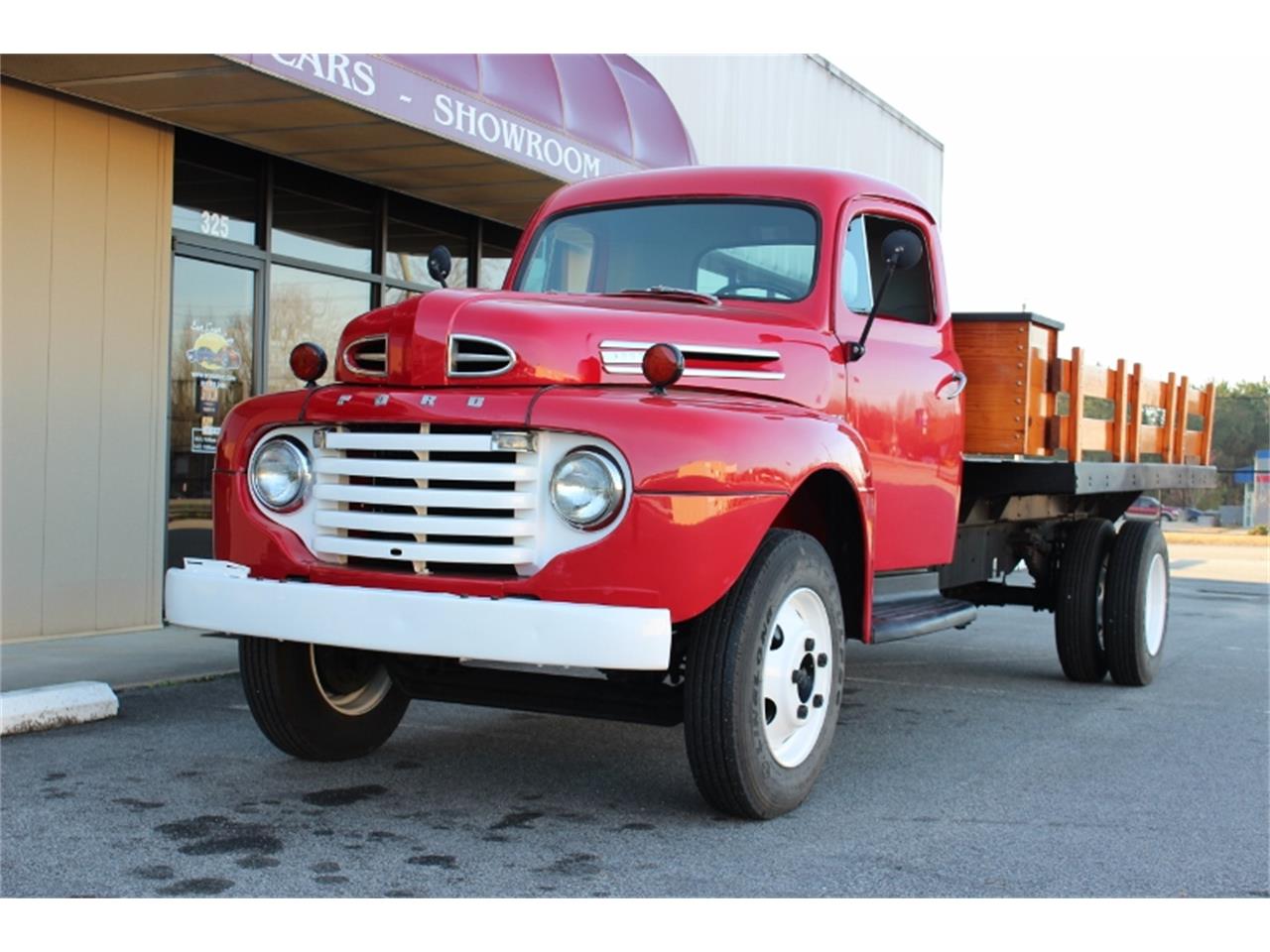 1949 Ford F-6 Truck Painted Red Vermillion that looks good, with the grill and bumper painted white. Running boards painted black with black bed liner. The stainless trim on hood is good. The head light trim rings look good, turn signals on front fenders, dual outside mirrors in black. Stainless door handles, new wood bed and sides. Wood box for storage, black bed strips, black bed edges. Looks good inside. Run by a 239 CID Flathead V8 with a 4-speed transmission.