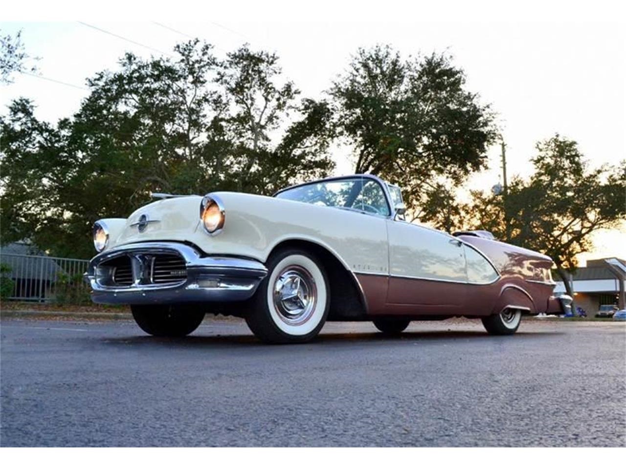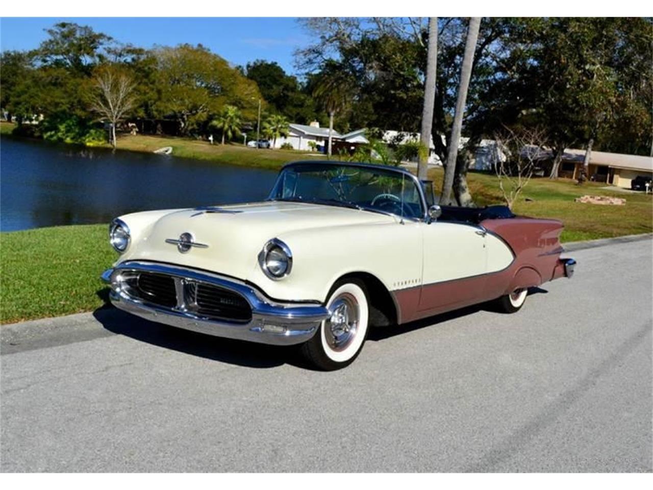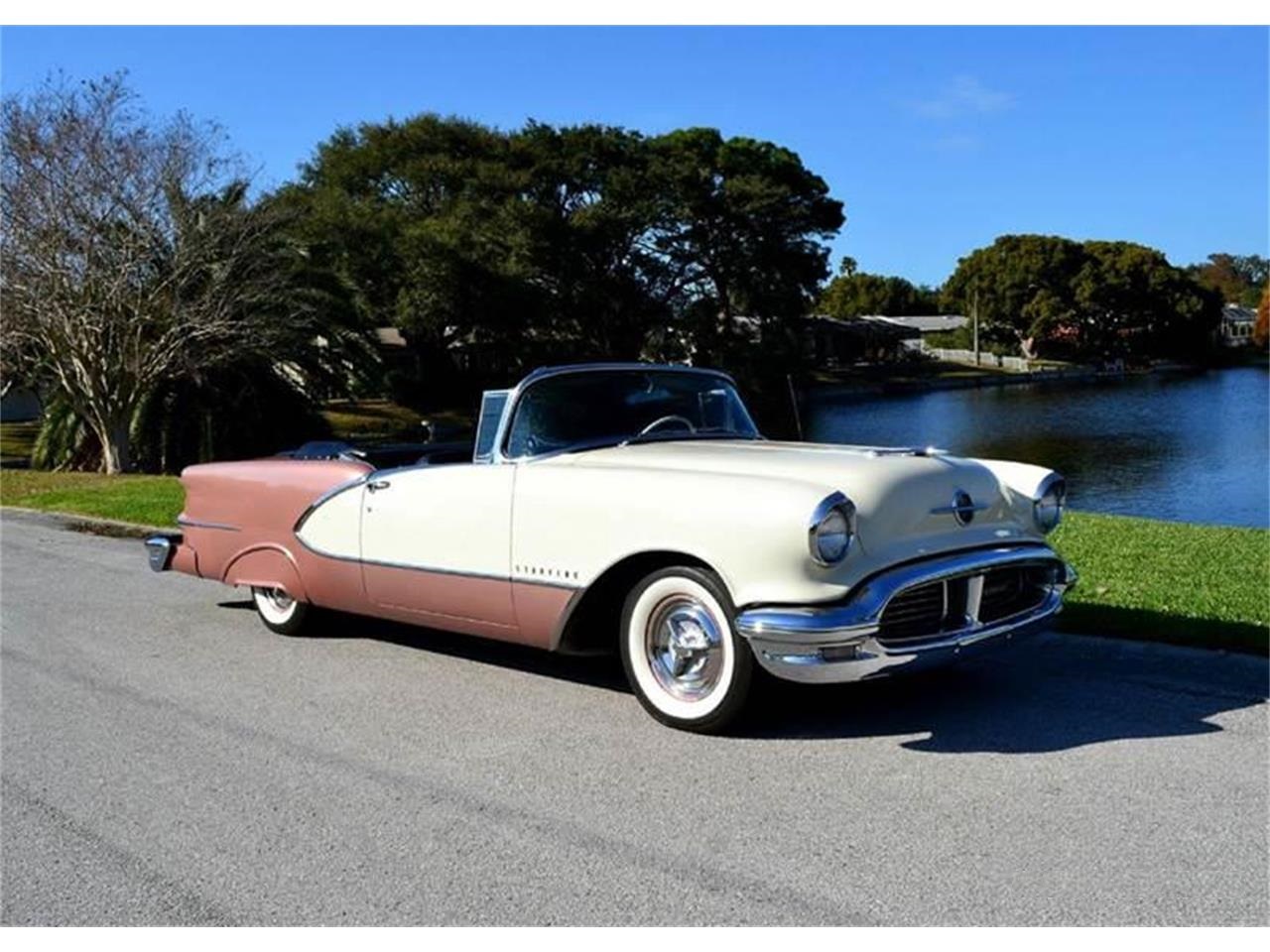 56 Oldsmobile 98 Starfire Convertible, 30355 miles, 324 cubic inch Rocket V8 engine, 4 barrel carburetor, dual exhaust, jetaway automatic transmission, power steering, power brakes, 15" radial white wall tires, cruise skirts, continental kit, reverse lights, two tone Rose Mist/Antique White exterior, white power convertible top with boot, two tone upholstery, power windows, power seat, super deluxe auto tune radio with foot activated auto tuner button. Completely rust free.