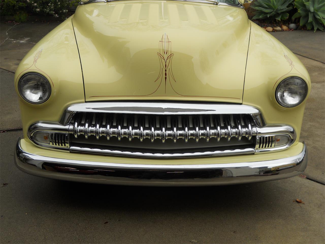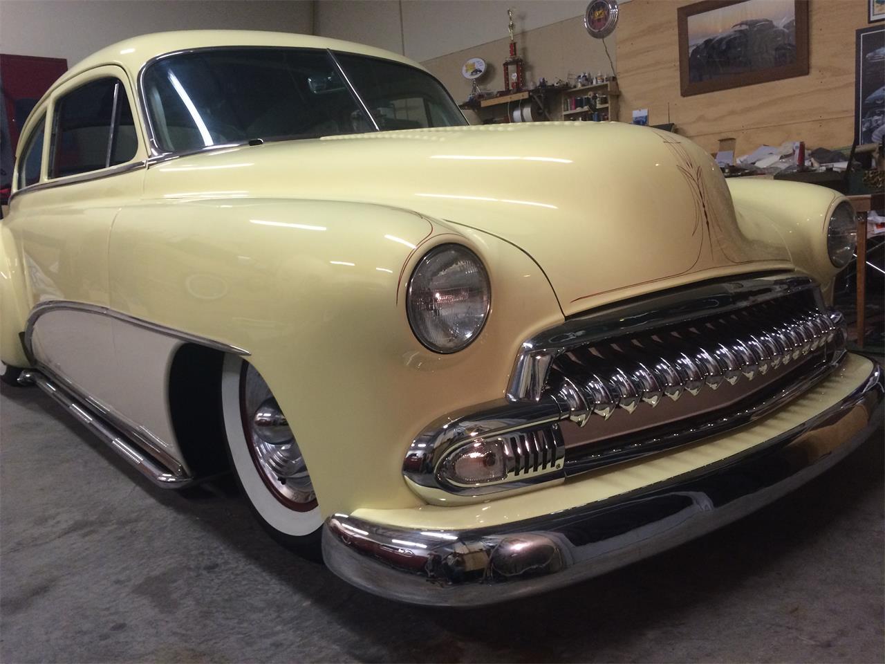 1952 Chevrolet Fleetline. House of Kolor Lemon Drop pastel yellow with gold pearl and Creme Brulee white. Air Bags, Coker WWW 195x75x15, Frenched headlights, nosed, decked, shaved emblems and door handles, 1956 Chevy rear wheel well opening, 1954 Dodge Royal tail lights tunneled in, 1954 Buick side stainless, seventeen stock teeth in grill, '51 Chevy turn signals, SBC 283, 350 tranny, 10" Chevy rear end, disc brakes in front, 1962 Oldsmobile deep dash steering wheel, white pearl interior with maroon. The seats are well padded and very comfortable on long rides. Steering wheel, dash knobs and glove box. Remote doors and trunk, aluminum radiator, 6-7-17 Holley 650 carburetor. Flamethrower Igniter distributor, igniter coil, telescoping hood prop rod, hot air defroster has a cut off valve on engine for cutting off in the summertime. The Pioneer radio plays single cd, 6 cd stacker, cassette player, I pod down load plug, stereo power amplifier. Top condition.