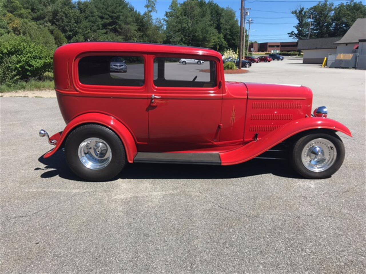 Professionally Built 1932 Ford Sedan Hot rod to the fullest complete custom English Leather Diamond Button Tuft interior Tubed with 9 Ford rear end super wide rear tires Built Chevy 350 with Turbo 350 Automatic transmission all chrome and paint finish shines nice Fire engine red Brown leather with black piping and buttons updated sound system with 6 kick panel speakers and IPod input CD player Real fast and very fun to drive it is a serious head tuner No expense spared when the was built. A perfect addition to any collection.