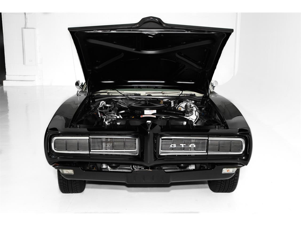 1968 Pontiac GTO convertible, Black with Black bucket console interior, 242 GTO vin and rear spoiler, hidden headlights, 400ci, automatic with his and hers shifter, PS, PB, as well as factory AC. This structurally outstanding true GTO convertible was professionally painted in a mirror finish jet black metallic. The metal structure is very nice, from the beautiful top to the solid intact original floors. This is a very desirable hidden head light GTO.
