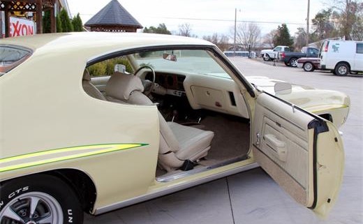 Looking at the body you will see it s straight as an arrow with all the door, hood and trunk gaps being very even. This being a GTO it has the Ram Air hood to go along with the dual sport mirrors and the wing out back. Everything is covered in the Sierra Yellow Paint that is accented by the Green and Yellow JUDGE Decals and stripes. The paint has been done in base coat clear coat and sports a mirror finish. At the time of the resto a new rear bumper was installed. As for the rest of the chrome and stainless it s all in excellent condition. All the glass looks awesome in this Pontiac and you can see that the seals and weather stripping have been replaced.
