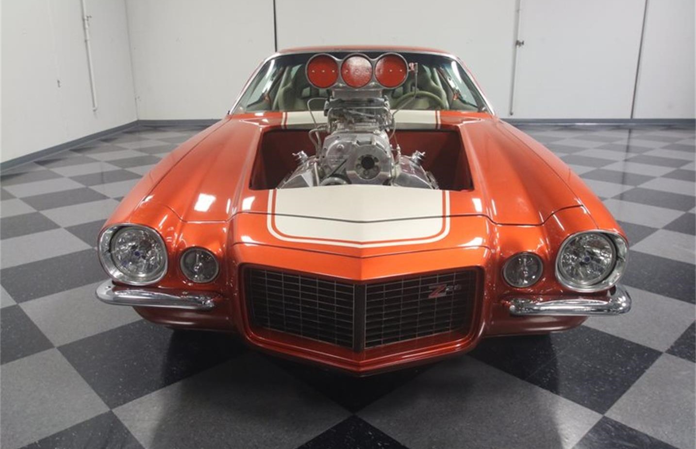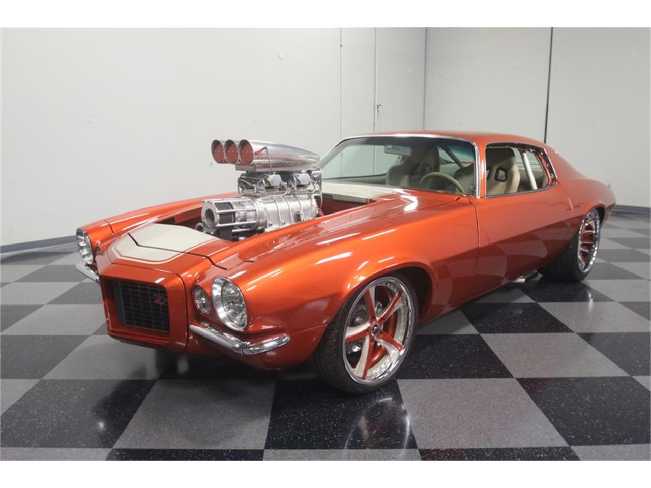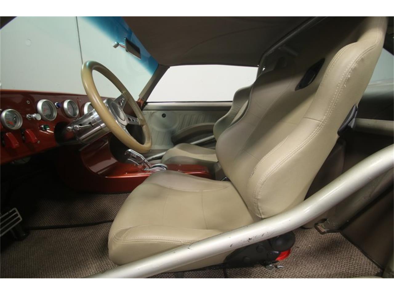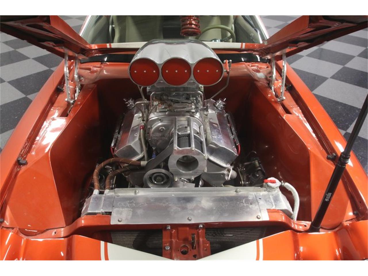 The interior is combat ready but still built for the street, thanks to comfortable tan bucket seats with provisions for harnesses, full carpets, and nicely finished door panels. No crude race car stuff here. The B.M shifter manages a TH400 3 speed automatic transmission and if you glance out the windshield, you ll see an extra pair of gauges for boost and fuel pressure mounted right to the back of the blower.
