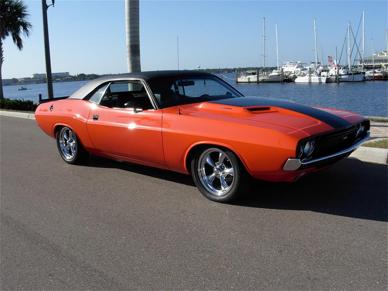 1972 Dodge Challenger Restomod. It is finished in beautiful Hemi Orange metallic paint accented by a fresh Black interior. Under the hood lies a fully built 440CI V8 engine with dual four barrel carburetors mated to a 4 speed manual transmission with Hurst pistol grip shifter and a sure grip rear end. Our Challenger sounds incredible but runs and drives even better.