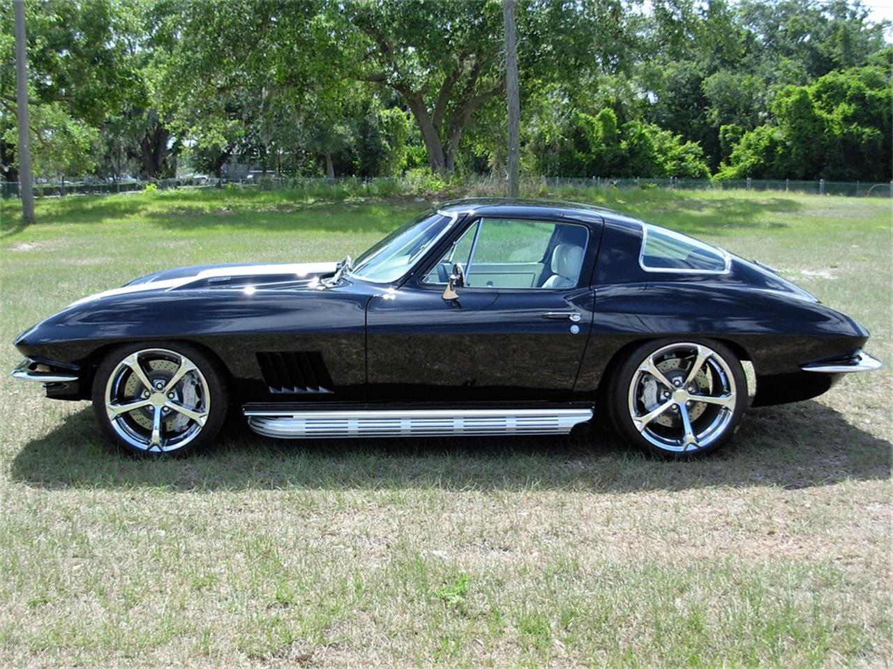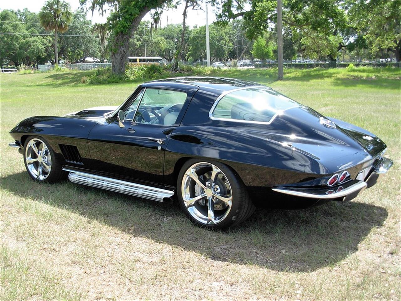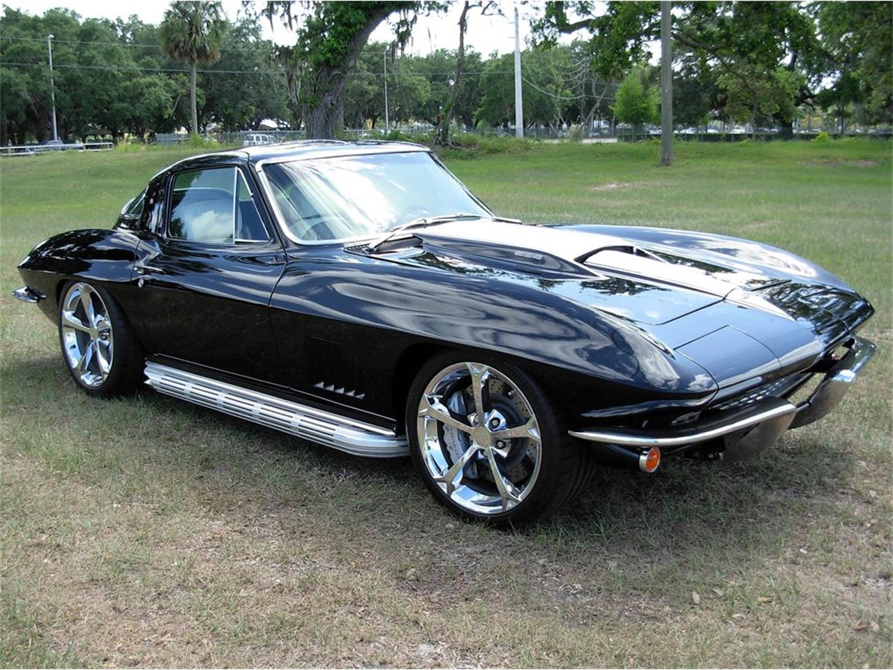 1967 Chevrolet Corvette Restomod Coupe. This incredible restomod Corvette is finished in beautiful Dupont Black Onyx paint accented by a White stinger and White interior. Our C2 has been brought into the 21st century thanks to its fuel injected LS3 6.2L V8 engine tuned to 600HP! The LS3 is mated to a Tremec TKO 600 5 speed manual transmission with overdrive. This no expense spared frame off build started with a clean no hit 67 Corvette body that was placed atop a custom Street Shop chassis equipped with polished C6 Corvette suspension front and rear, polished Viper center section and differential w/ 3.32 gear ratio, and 6 piston C6 Corvette brakes all the way around. This Restomod is full of other modern features including power steering, power brakes, power windows, Vintage Air heat and air conditioning, custom dash with hide away touchscreen featuring Bluetooth, navigation and back up camera, custom stereo system, Flaming River tilt steering column, New Al Knoch leather seats with headrests, custom ram air intake, front and rear sway bars, adjustible coil overs front and rear, custom factory style side exit exhaust, new stainless trim and bumpers, and Corvette Grand Sport wheels wrapped in Michelin radial tires.