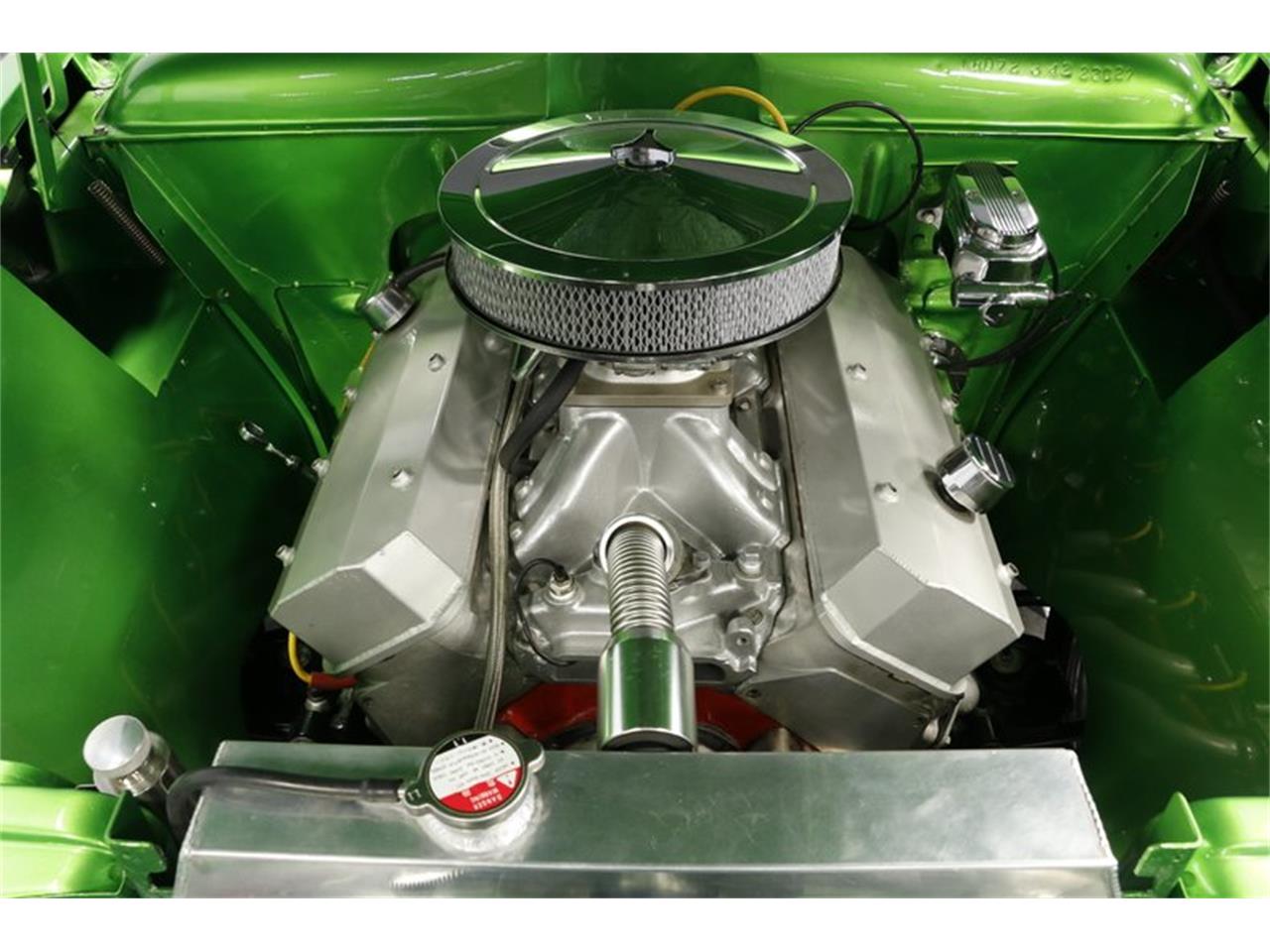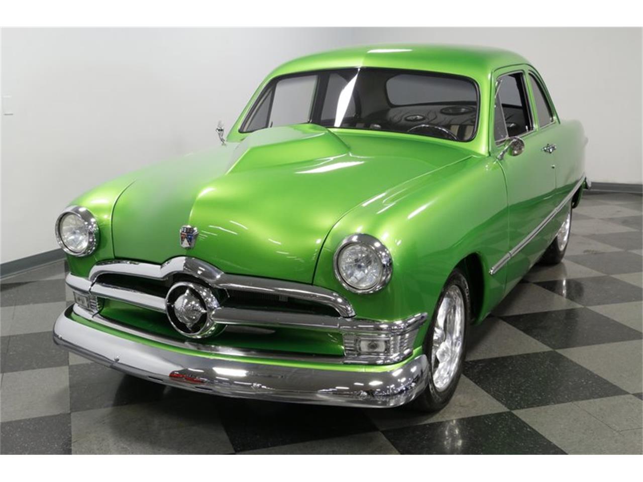 A super-slick exterior, comfy custom interior, full suspension upgrades, and huge V8 power make this 1950 Ford Business Coupe Pro Street one mean and green custom build. Ford had one of the best three-box designs with the sleek business coupe, and it was one of the rarest styles for 1950. The appeal of the custom interior is as clear as black and white... literally. The door panels, low-back bucket seats, and contoured center console have a terrific two-tone striped appearance. The cool purple glow from the custom lighting is a masterful touch of color. This has all the right upgrades, including a Lokar shifter, cup holders, custom chrome steering wheel on a chrome tilt column, upgraded full gauge panel, and an AM/FM radio with iPod hookup. Plus, as a true business coupe, this just has a parcel shelf in the rear. But even that's been upgraded with a cool flame-kissed panel that now houses the full speaker package w/subwoofer. The big trunk contains a fuel cell and a nice indicator of what's powering this pro street machine.
