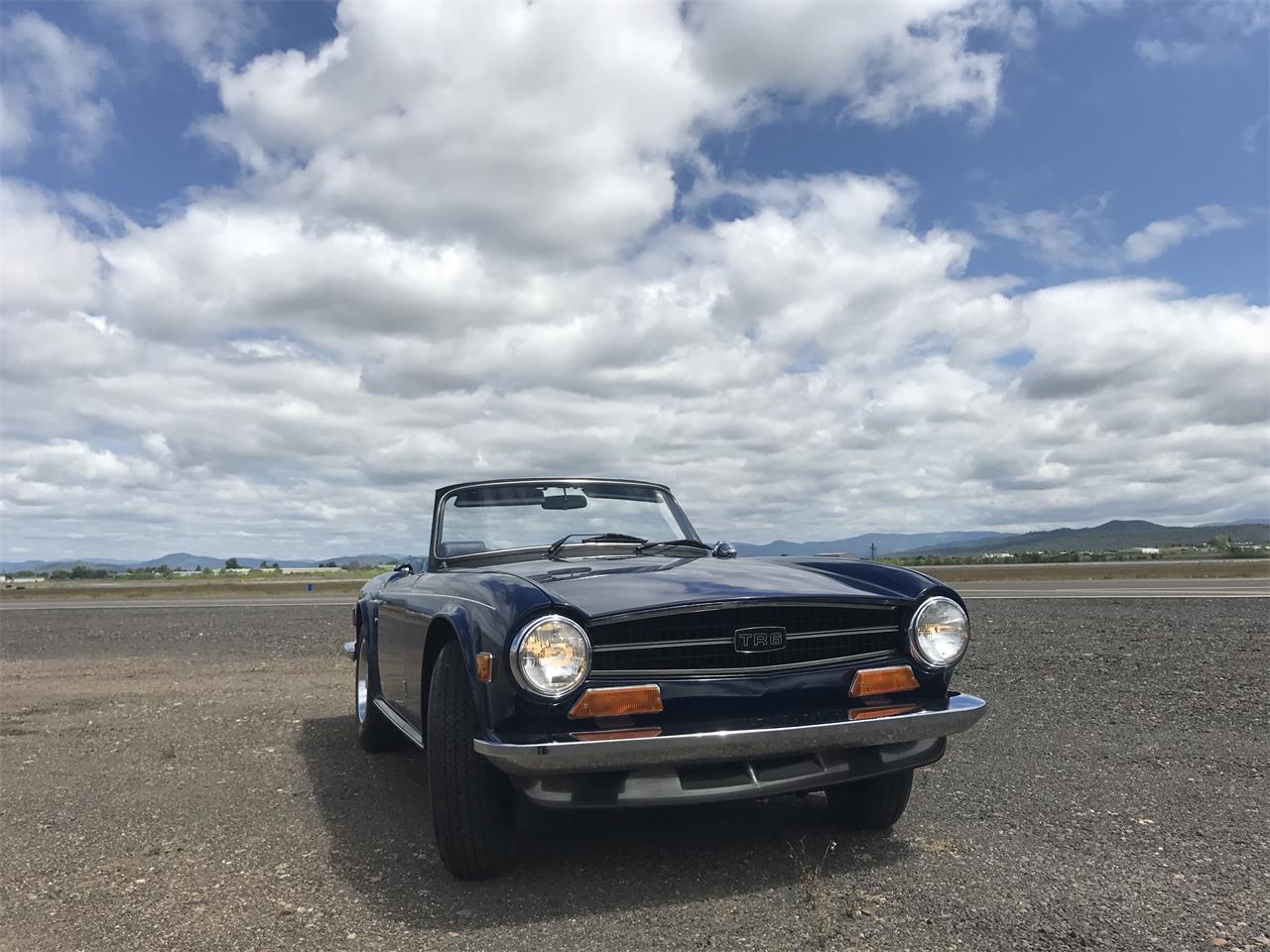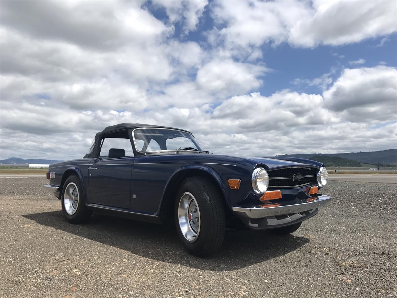 This 1973 Triumph TR6 is a Sapphire Blue example with a black soft top, Shadow Blue interior, 2.5L inline-six, and 4 speed manual transmission. Shadow Blue vinyl trims the seats, door panels, soft top boot, and e-brake cover. The wood dash houses fully functioning Smiths gauges including a 5-digit odometer. Power comes from a 2.5L inline-six, new timing chain, camshaft, cam gear, crank gear, brake master cylinder, and battery isolation. Shifting is through a 4-speed manual transmission.