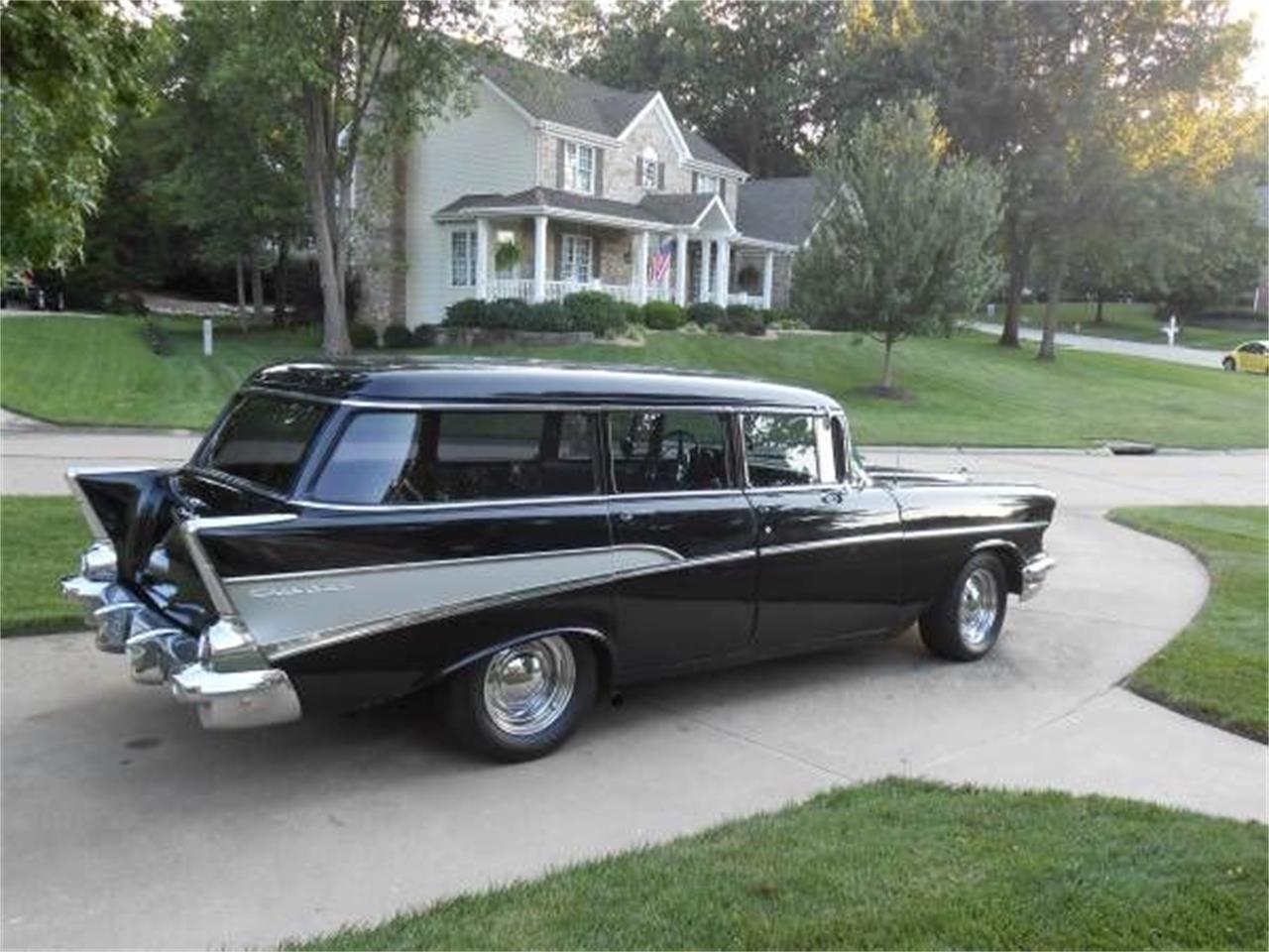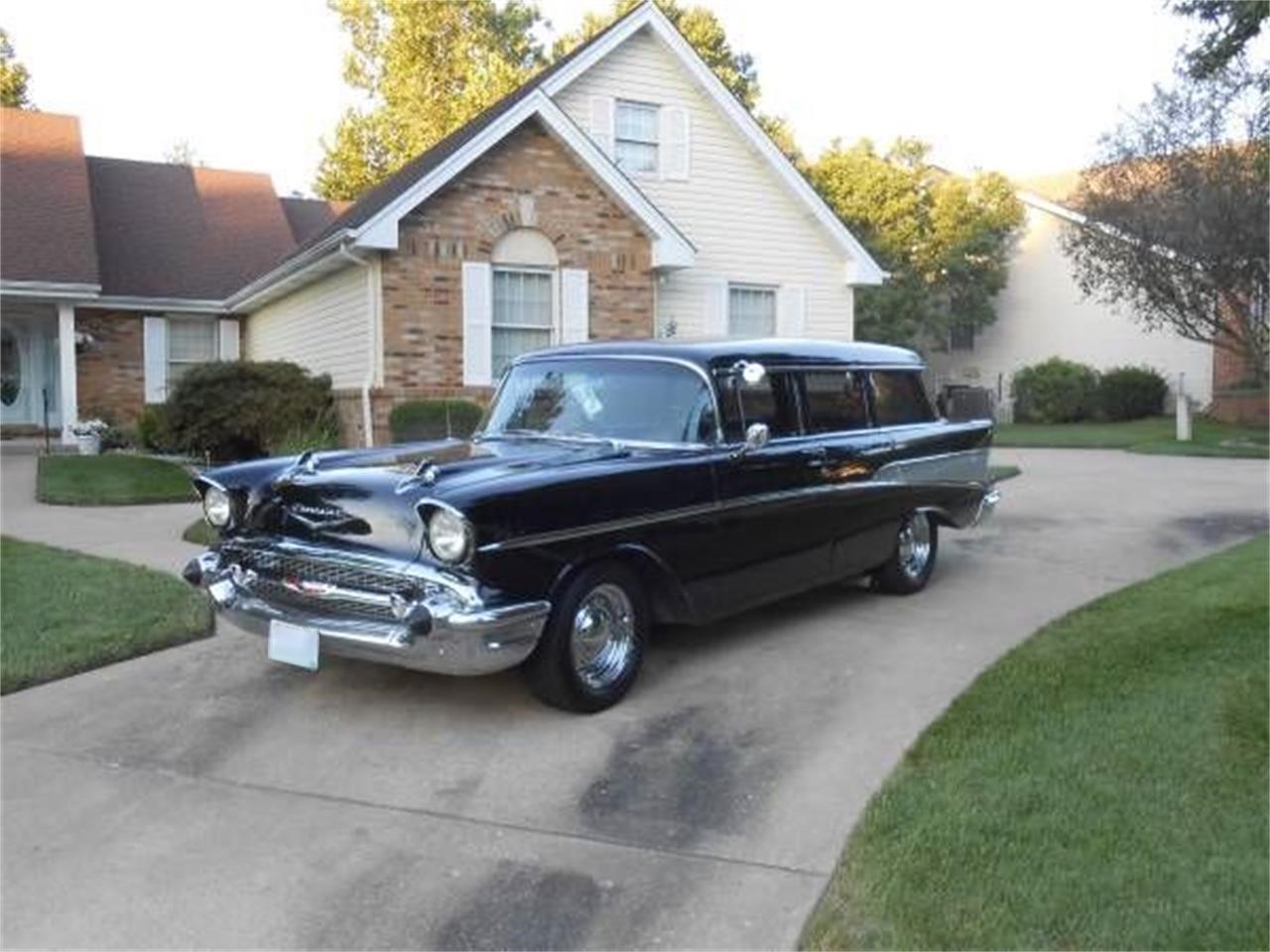 1957 Chevrolet Bel Air 4 door Station Wagon for sale. It has new interior, tinted glass, Lokar floor shifter knob, power disc brakes, a 350 engine, 700 R transmission, chrome wheels, baby moon hub caps, power front windows, electric wipers, and a great sounding exhaust.