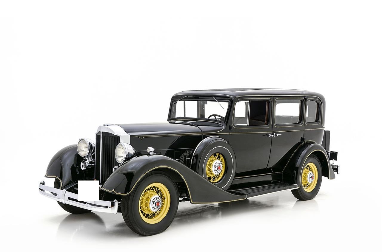 The black paintwork is in fine order all around, though some minor imperfections are noted upon inspection. Plating on the bumpers, headlamps, radiator shell, and other body fittings is excellent, with a uniform finish consistent with the restoration's age. Dual side-mount spare wheels feature body-color metal covers, and a period-style trunk rests on the trunk rack, complete with a custom upholstered cover. The 11th Series' fully skirted fenders, lower ride height, and raked tilt-open windscreen give this sedan a distinctly elegant profile. Inside, gray fabric upholstery adorns the seats and side panels. The soft trim is in lovely order in both the front and rear compartments, showing signs of light use in the time since the restoration. Slight discoloration of the driver's carpet is noted, while the upholstery in the rear compartment is excellent and appears to have had little use. Passengers enjoy a spacious rear bench with built-in cigar lighters, ornate wood-grain trim, a folding footrest, opening rear quarter glass, and privacy blinds. More wood-grain trim features on the front window surrounds and on the dash, which houses an array of Waltham instruments in a finely detailed chrome panel. Displacing 319 cubic inches, the L-head inline-eight is rated for 120 horsepower at 3,200 RPM.